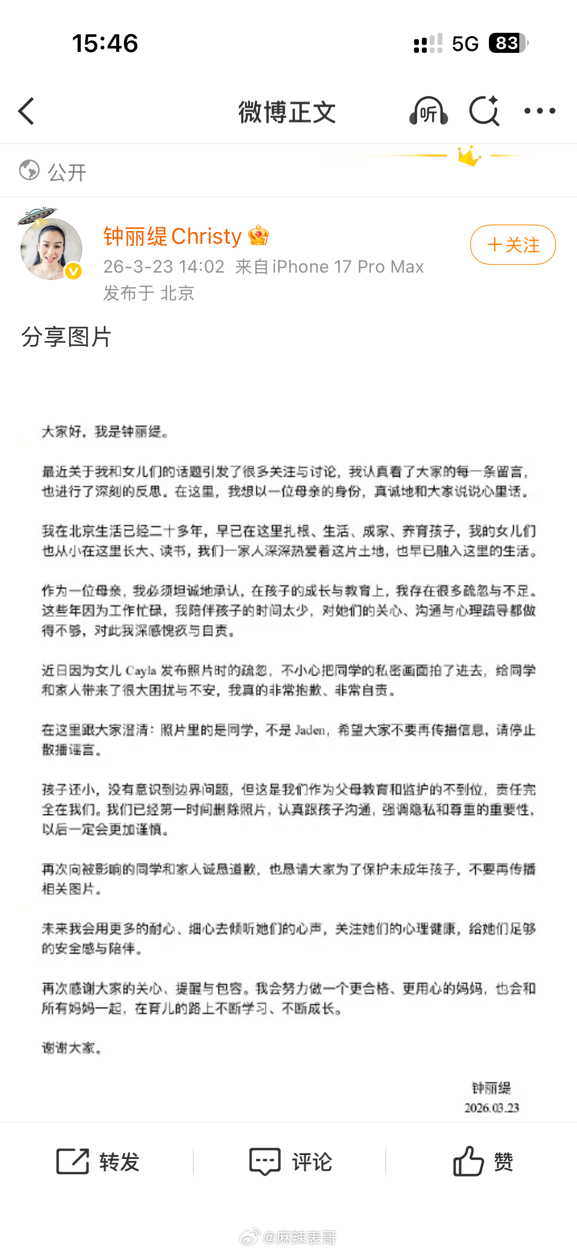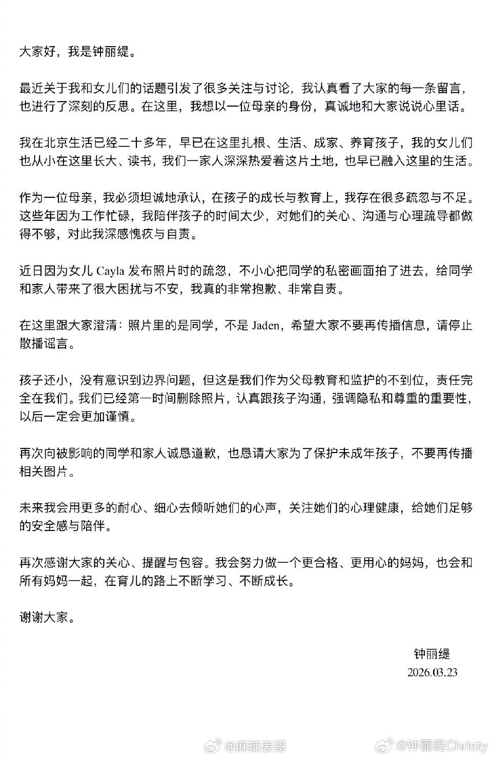 钟丽缇发文回应了女儿最近的争议,说考拉拍的上厕所的女生不是姐姐jaden,而是自己的同学。