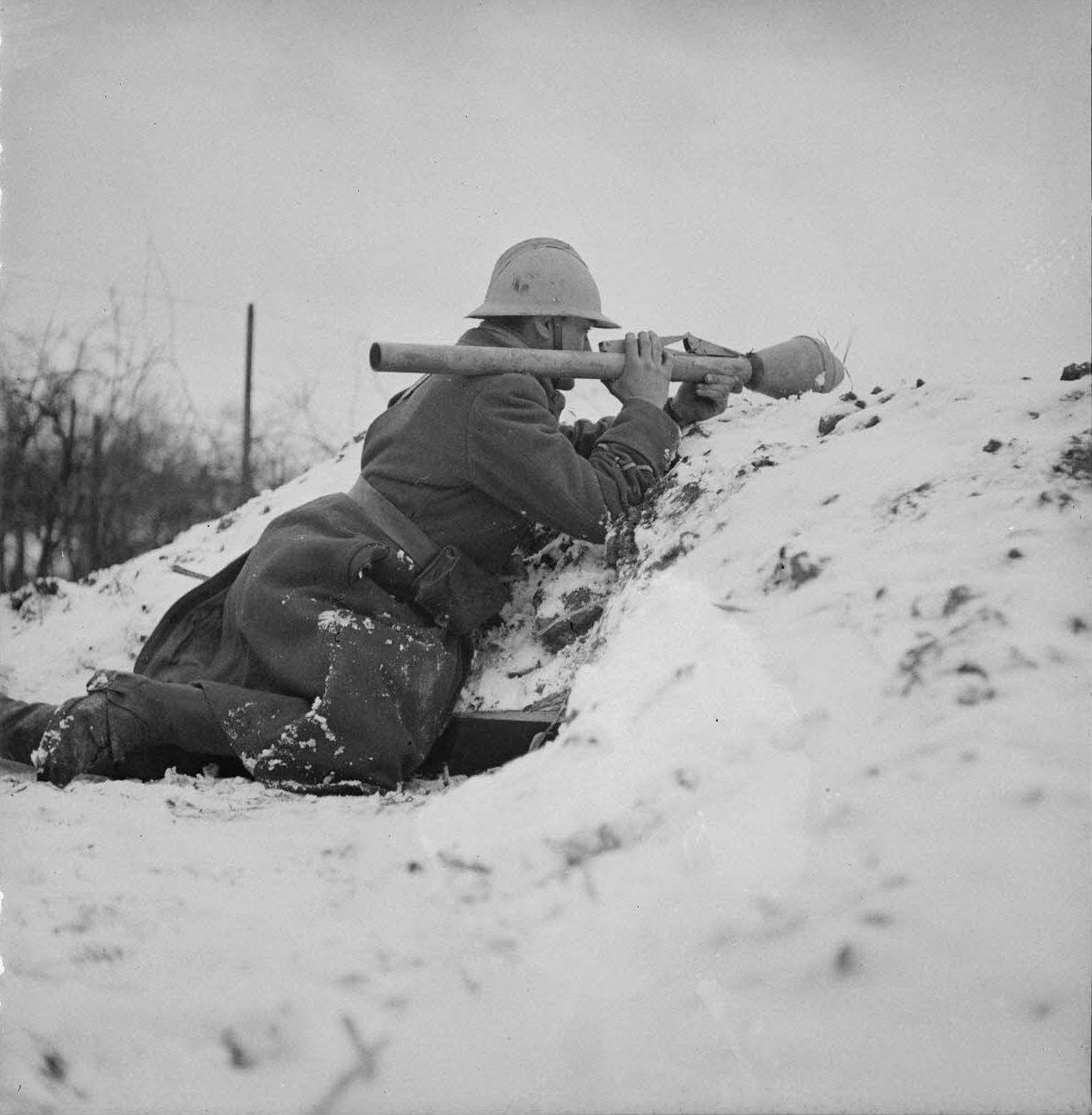 [呲牙] 用缴获的武器更解气——1945 年,法国阿尔萨斯地区,基尔斯泰特的战斗中,一名法国宪兵正举着缴获的德军铁拳 60 型反坦克火箭筒瞄准射击。 铁拳 60(Panzerfaust 60)是德军单兵一次性反坦克武器(参见图2,各种“铁拳”),盟军缴获后经常直接拿来用。 基尔斯泰特(Kilstett)战役属于 1945 年初阿尔萨斯攻防战的一部分,法军在本土和德军进行最后的拉锯。