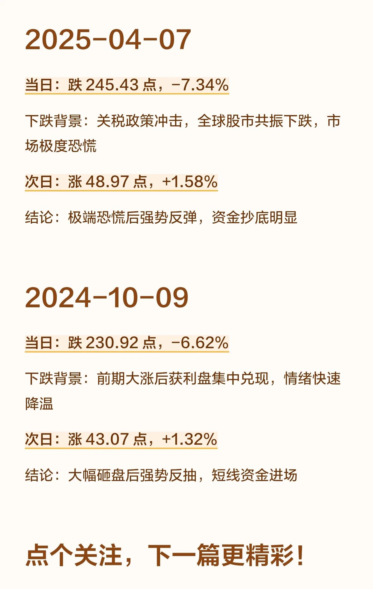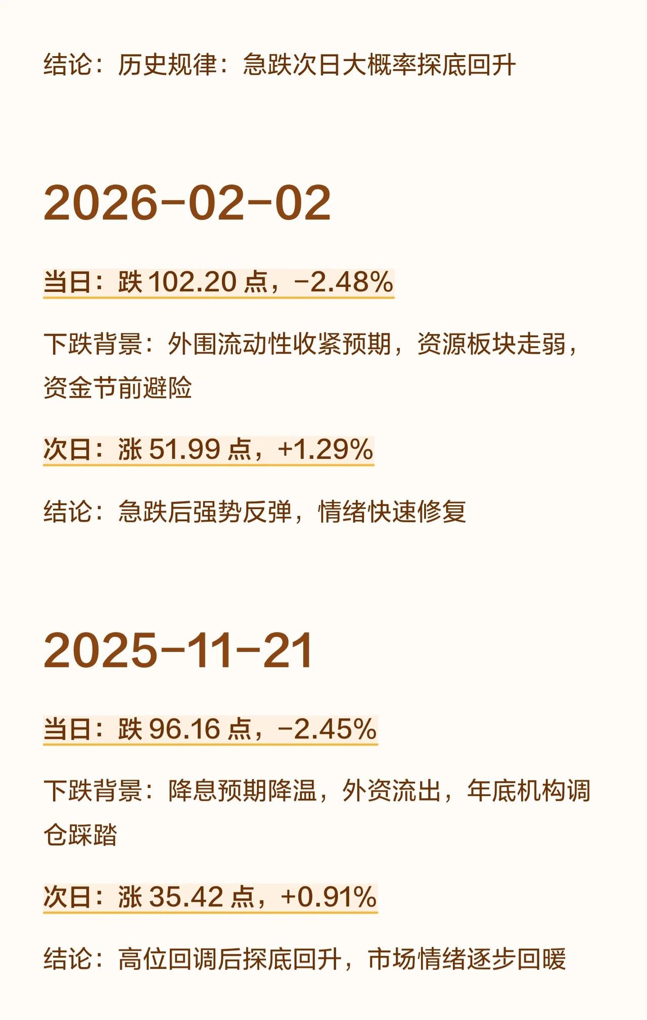 上证指数历史上5次单日大跌(多数跌幅超2%,其中两次跌超6%)的案例,总结出急跌次日大概率探底回升的规律。 具体来看: - 2026年2月2日,当日因外围流动性收紧等因素跌102.20点(-2.48%),次日强势反弹,上涨51.99点(+1.29%),情绪快速修复。 - 2025年11月21日,当日因降息预期降温等跌96.16点(-2.45%),次日探底回升,上涨35.42点(+0.91%),市场情绪逐步回暖。 - 2025年4月7日,当日因关税政策冲击等出现极端恐慌,跌245.43点(-7.34%),次日强势反弹,上涨48.97点(+1.58%),资金抄底明显。 - 2024年10月9日,当日因前期大涨后获利盘兑现跌230.92点(-6.62%),次日强势反抽,上涨43.07点(+1.32%),短线资金进场。 此外,2026年3月23日上证指数当日上午跌98.87点(-2.56%),因美联储鹰派信号、地缘扰动等因素触发调整,其次日(3月24日)走势尚待验证。 整体而言,历史数据显示,在经历大幅急跌后,市场往往在次日出现修复性上涨,情绪快速回升,甚至伴随资金抄底,呈现出“急跌反弹”的特征。