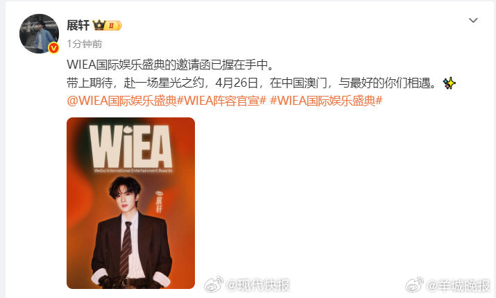 【#展轩回应参加WIEA国际娱乐盛典#】3月23日,#WIEA阵容官宣# 。发文回应:WIEA国际娱乐盛典的邀请函已握在手中。带上期待,赴一场星光之约,4月26日,在中国澳门,与最好的你们相遇。✨ (现代快报)更多消息:#林心如怎么受得了霍建华这条牛仔裤##关晓彤 至今不知道腿长的坏处##梓渝新专辑新电影新巡演##奚梦瑶何猷君儿子女儿正脸照##等太湖湾音乐节官宣#(编辑:惠天骄;审签:艾渝)