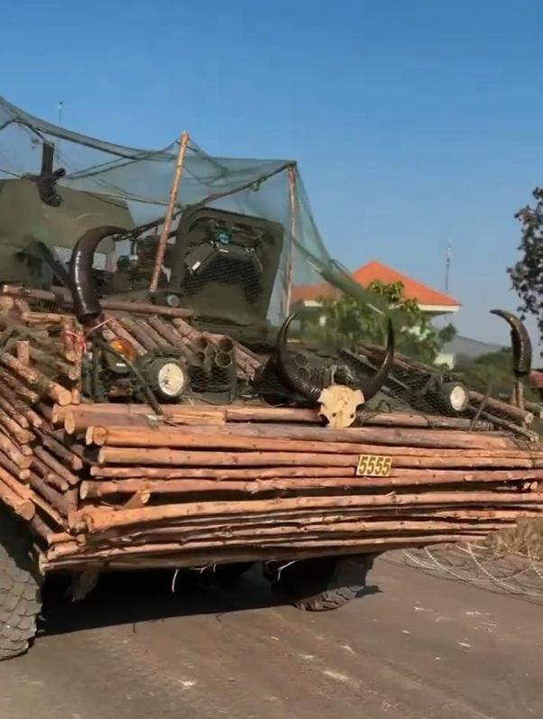 泰国陆军的M113装甲运兵车,这些车辆经过改装,加装了竹片装甲和防护网,旨在抵御反坦克武器的攻击;由于其粗犷且充满即兴色彩的外观,甚至还悬挂着水牛头骨作为文化图腾或威慑标志,这些战车散发出一种《疯狂的麦克斯》式的末世废土风格。 在2025年12月的边境冲突中,正是这些竹制防护结构成功弹开了柬埔寨军队发射的PF-89型火箭弹。