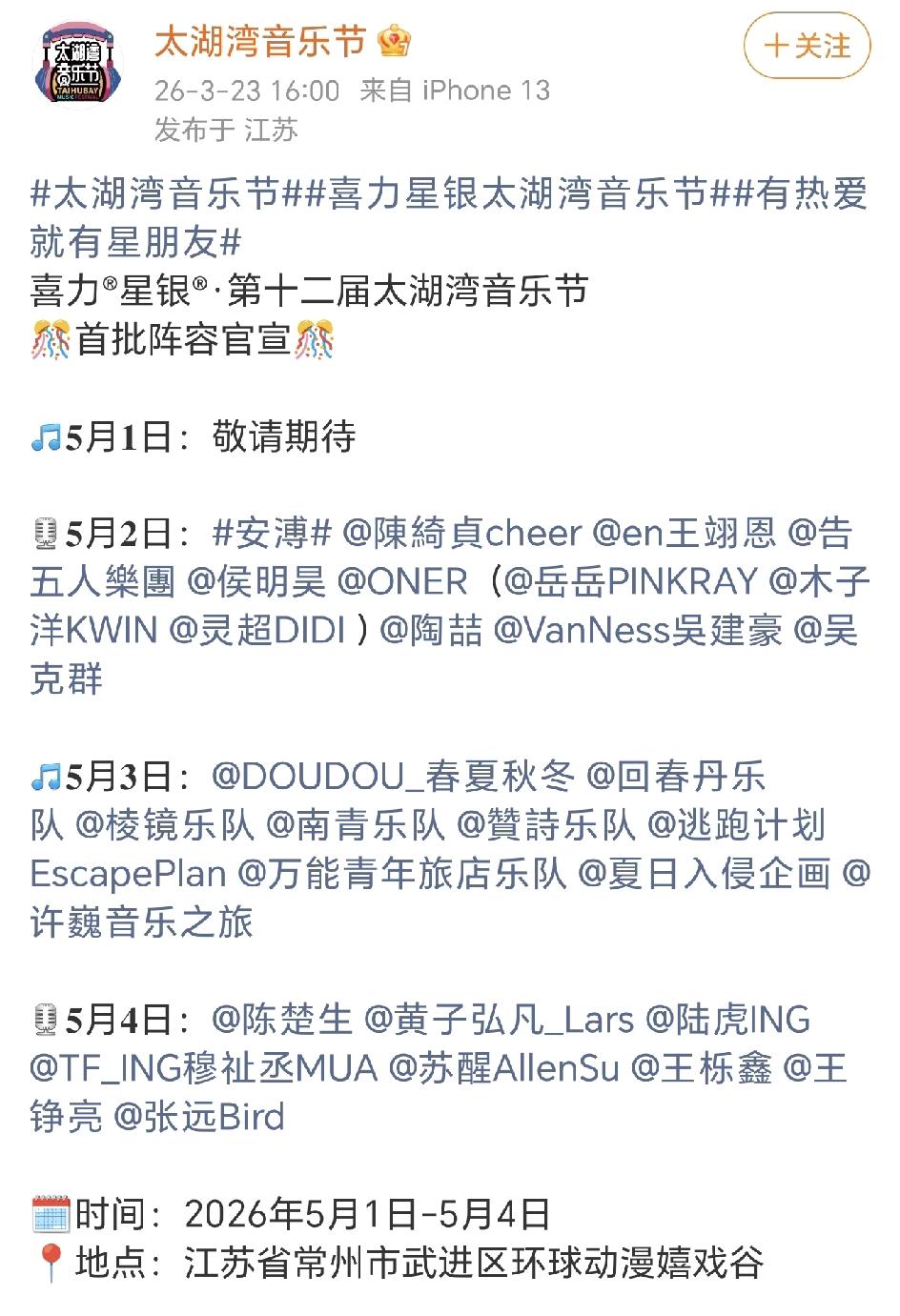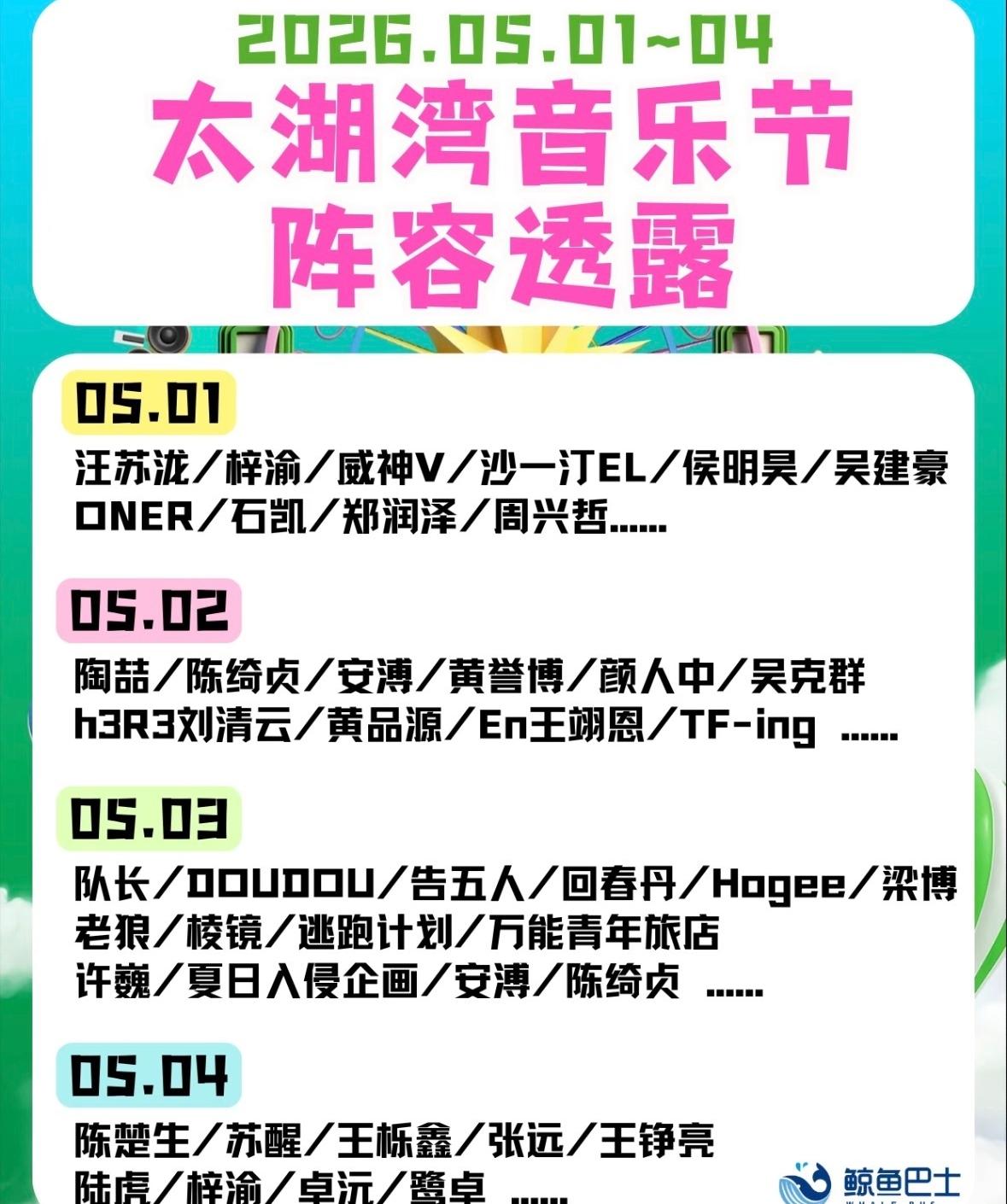 太湖湾音乐节官宣,再就业兄弟们又又又合体了,他们这是和太湖湾签定了终身制吗。 近两年兄弟们在一起的机会越来越少了,除了快乐老友记和快乐再出发,能在同一个场合看到他们的只有这一个音乐节。 去年的太湖湾音乐节,兄弟们还给现场的歌迷包括陈楚生一个大大的惊喜,陈楚生演唱活该刚唱了两句王栎鑫上场,然后就一个一个全上来了,陈楚生惊讶的样子看来也是后知知觉,再后来陈楚生就变成了吉他手,太湖湾上空还燃放了烟花,全场欢呼声一片,这哪是音乐节啊,这勘比专场演唱会。 也只有那一次,去年的十一同样是太湖湾,兄弟们依次演唱就没有再同台了。 今年,依旧是春意盎然的太湖湾,兄弟们还会合体吗?太湖湾音乐节