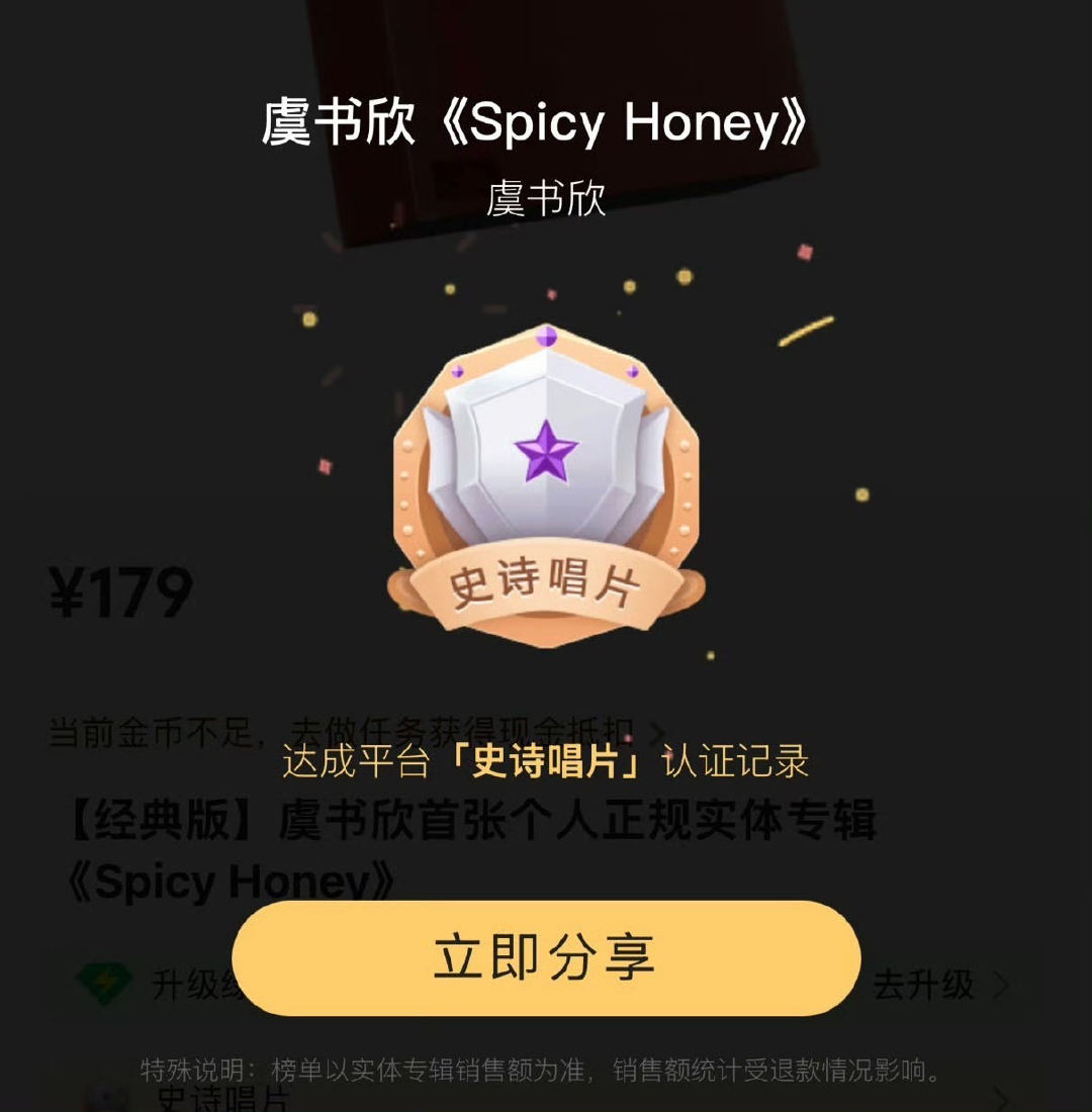 虞书欣内娱唯一史诗唱片女歌手虞书欣用《Spicy Honey》证明歌手实力,斩获史诗级唱片,是内娱唯一达此成就女歌手,踏实努力未来无限!