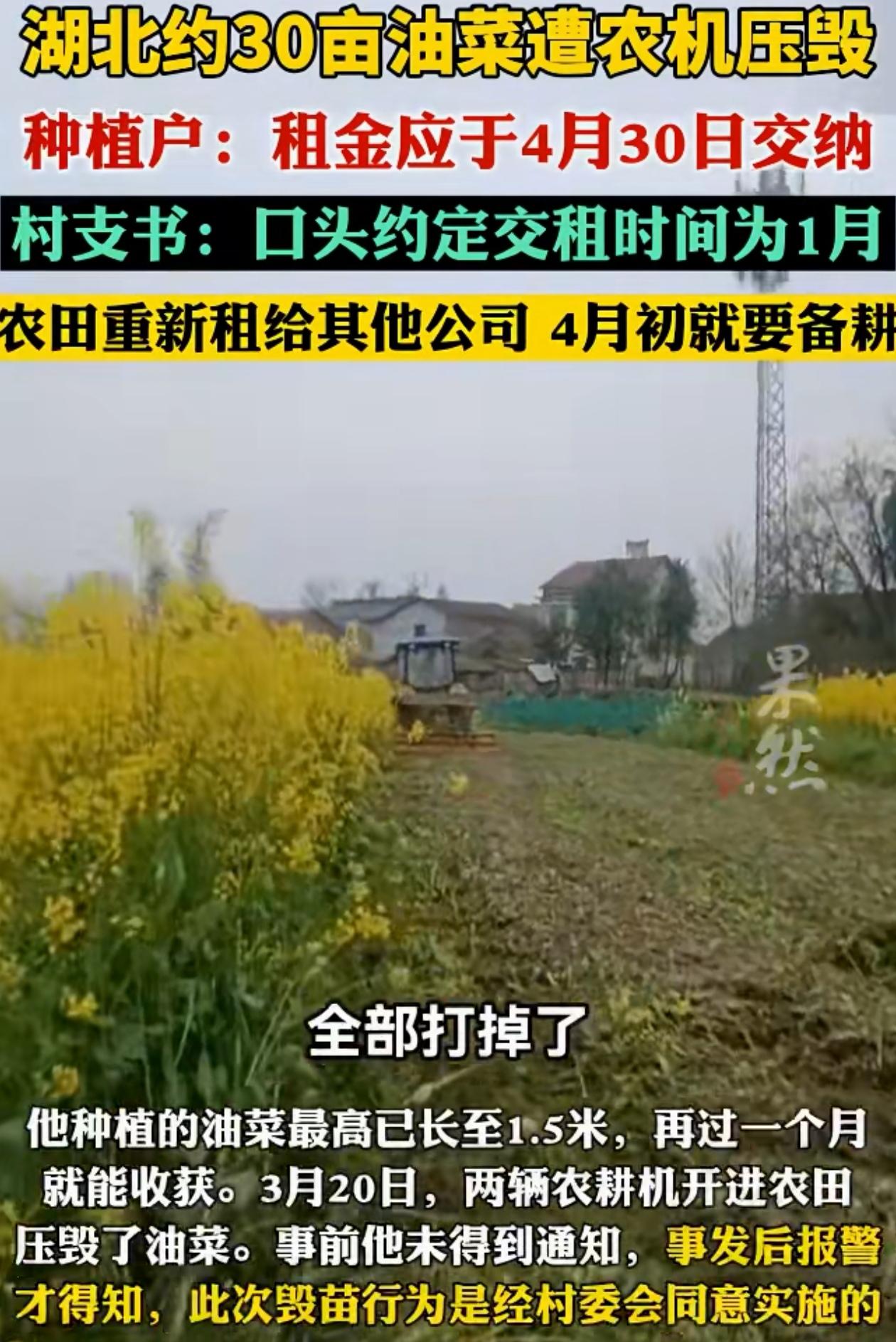 “有必要吗?”湖北咸宁,农户自家种的30亩油菜花马上就能收了,却有人开来两辆农耕机,把整片田全给压了。村支书:他超时不交租! 可惜这么多粮食都被糟蹋了! 当时农户就被气得够呛,不过村里对这件事却有自己的说法。 村支书说他们是实行租一年交一年租的方式,这家人是去年就租了一年,本来今年应该1月交租,但就是没交。 村里可能觉得他们不愿意接着租了,就干脆租给了另一家人。但人家又着急种水稻,看到田里还有这么多油菜花,担心再等下去误了农时,所以直接开来两辆农耕机,把这批油菜花都给推平了。 村里态度倒是挺明确,这批油菜花多少钱,他们都愿意赔。 但有网友说这不是赔不赔偿的问题,关键是这么做多糟蹋粮食啊。 还有网友说就不能换一种方式吗?不理解为什么非得推平! 村支书说“4月初要备耕,不误农时”,这话在理。水稻种植讲究节气,晚几天可能影响一季收成。可另一边,赵师傅的油菜也到了灌浆期,再等一个月就是实实在在的收成。 说到底,这冲突的根源是土地流转和作物周期没衔接好。高标准农田本意是提高效率,但管理跟不上,反而造成资源浪费和矛盾。 而且根据《湖北省农村集体经济承包合同管理条例》,即便承包方违约,要想收回土地、处置地上作物也该有程序,比如提前书面通知、给予合理清理期。直接让农机开进去压,手法简单粗暴,确实伤了农户的心,也容易激化矛盾。 油菜被毁,损失是实实在在的。不光有投入的种子、化肥、人工,还有眼看就到手的预期收益。怎么赔?按成本价还是市场价? 这事儿最好的结局,不仅是谈妥一个赔偿数字,更是以此为契机,推动村里土地流转签上规范合同,避免这样的情况再出现! 你觉得这件事谁更在理,可以留下你的看法!