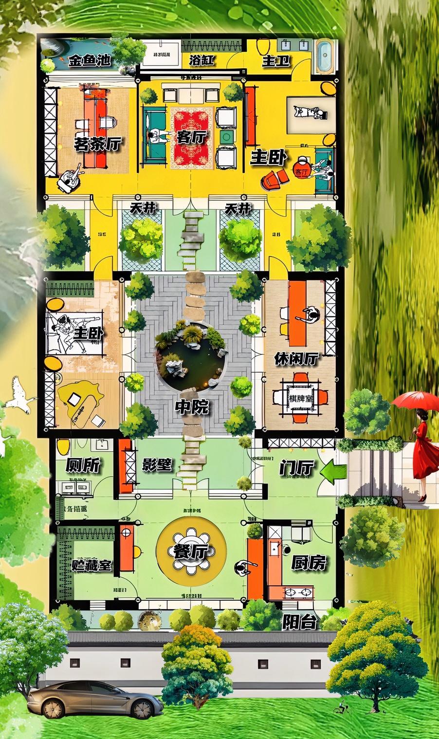 不知道为啥?300㎡老合院真的有一种天真烂漫的感觉,粗茶淡饭在前院,书香门第在中院,碧池绿水藏后院, 这个小改造,不讲大道理,只想烟火气,把我半辈子的石头心融化了! 就把门,开在东侧,算是懂得藏拙,不能锋芒毕露! 厨房和餐厅加贮藏室,可能布局上碰上麻烦,但三联横厅很实用,11米小露台进一步提升横厅的视野! 忽然东厨西厕,布局上玩的娴熟,也能灵活运用! 所以,影壁藏厕所,真的妙!收纳还不缺! 一进式格局,正常,四个天井不常见,不是亘古不变的左右小院,而是对称的四联天井,更能创造出有,一排沉浸式的有序的窗景! 堂尾走亮,主卧变得有深度,茶厅有情调,反正又是一个布局上三联横厅,而且有春天的浪漫! 尤其是21㎡茗茶厅后的,小金鱼池, 被阳光唤醒一个低调内敛的家,老式的自建房! 比如说东边有主卧,不重收纳,重意境,不管动线怎么样,主打一个专治老宅子的各种不服。 所以大院开东侧门,是好兆头。 一半是四合院走好运,一半是布局合理有道理! 这个老院子美,不是玩的!
