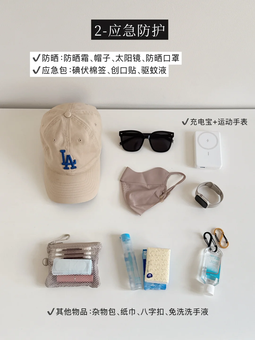 防晒:防晒霜、帽子、太阳镜、防晒口罩