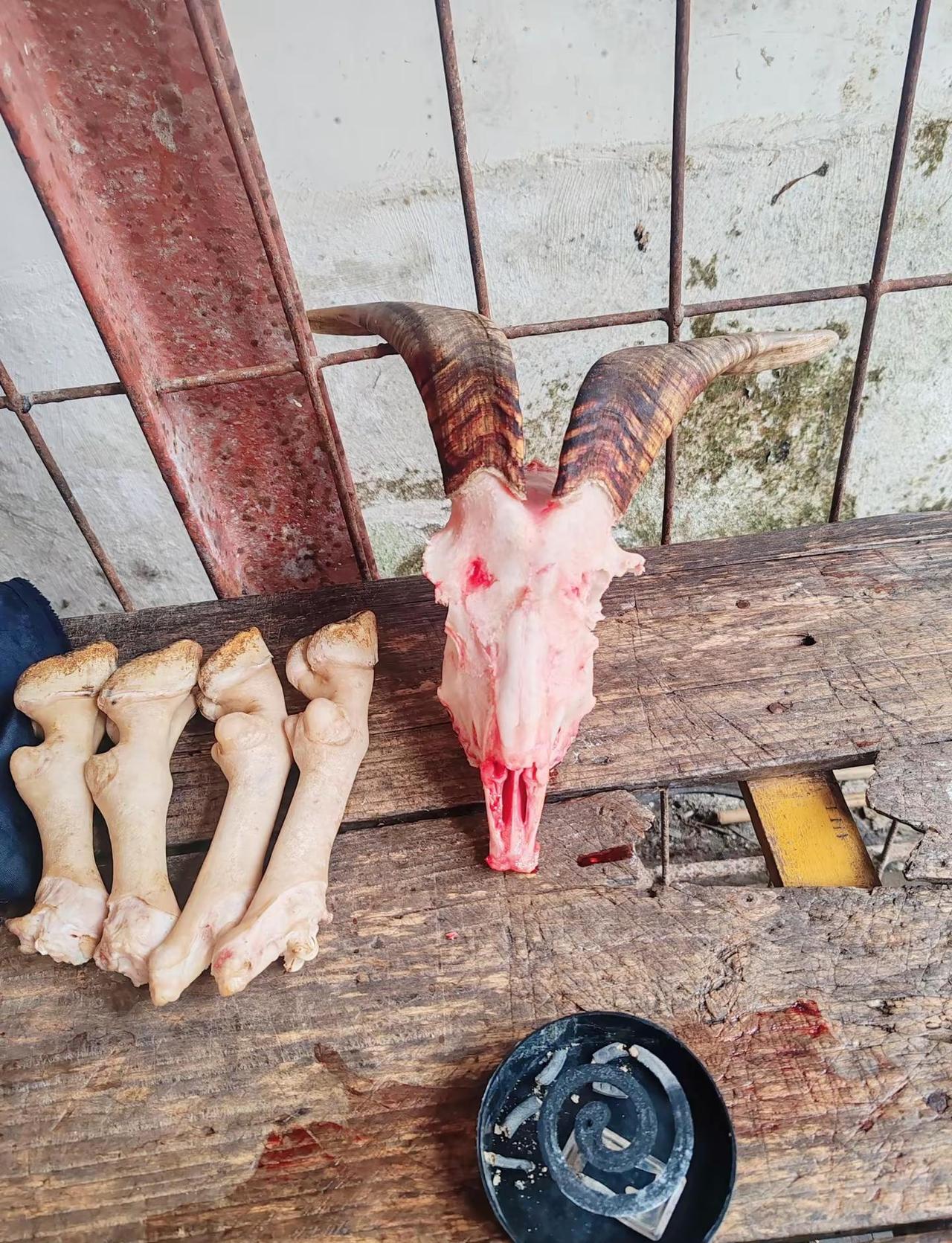肉台上的羊头羊脚。