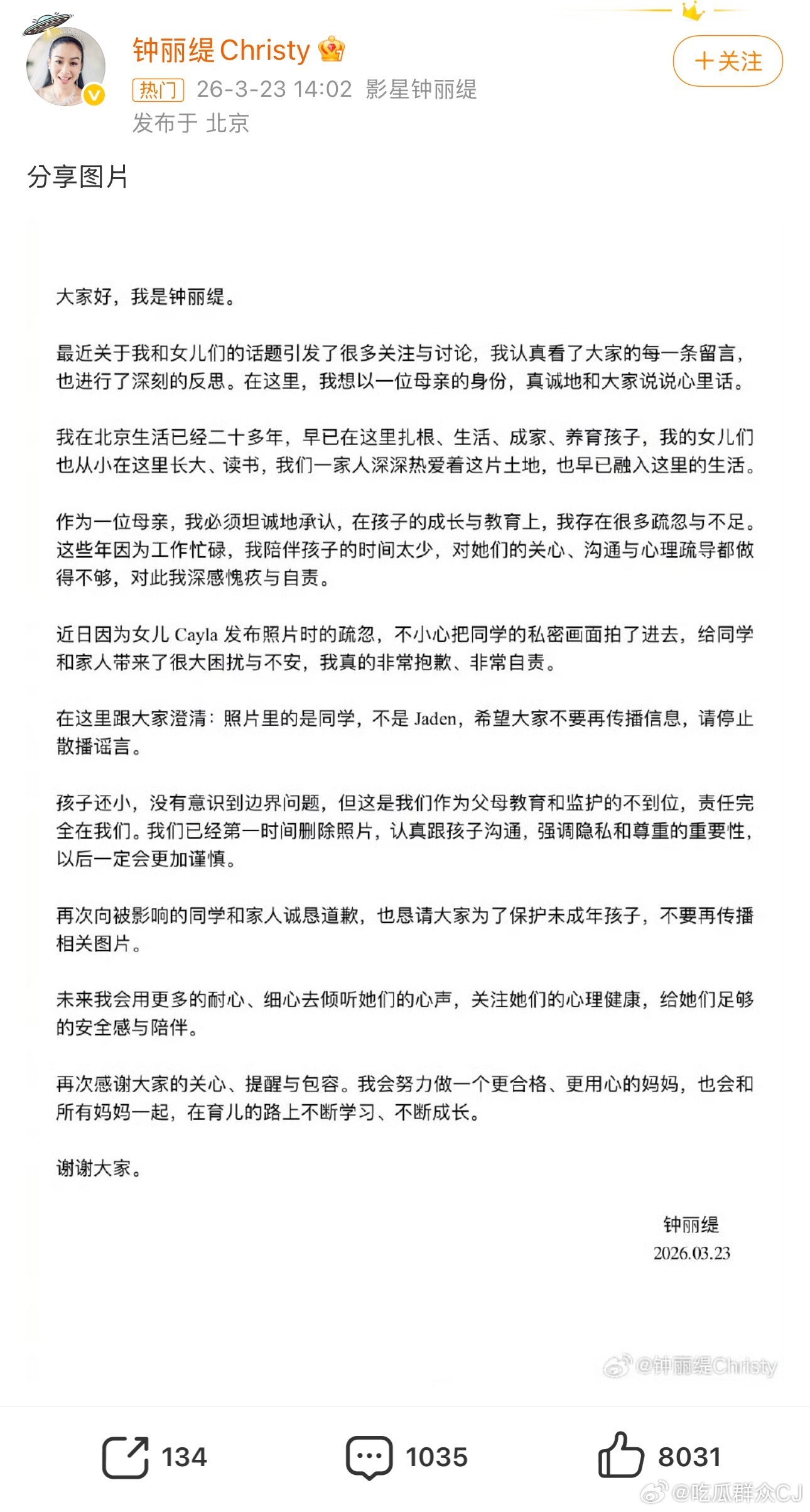 今天下午钟丽缇发文解释,先是明确了一家长期生活在北京已经完全融入、非常热爱的立场,然后解释考拉拍到的女生并非Jaden而是同学,承认家长教育和监护不到位,向被拍到的同学及其家长致歉。