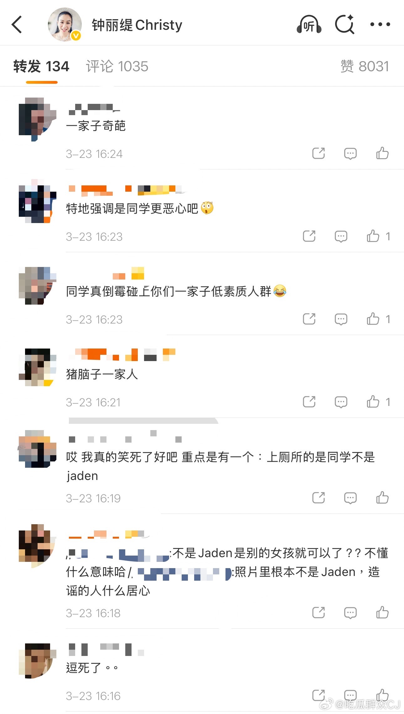 钟丽缇原博评论区还有人在庆幸,被拍到的不是Jaden,可是拍同学问题更大不是吗?考拉已经16岁了,不是6岁,其它事情她可能承担不了责任,自拍拍到别人私密一面还不当回事地随手po出,就是教育缺失就是素质有待商榷,很难评。