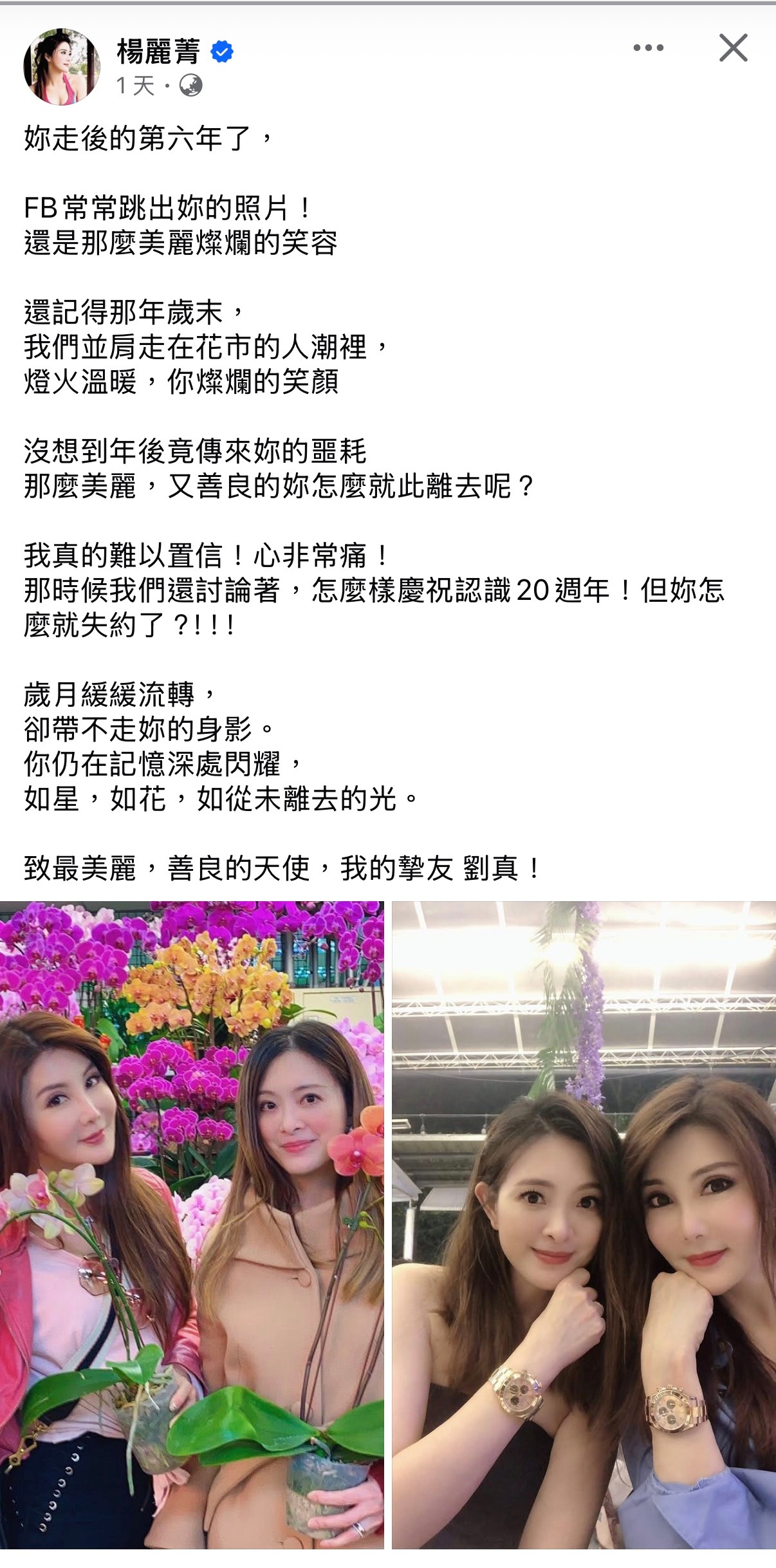 杨丽菁发文晒出跟刘真的合照,两人曾经约定要庆祝认识20周年。今年是刘真离开的第六