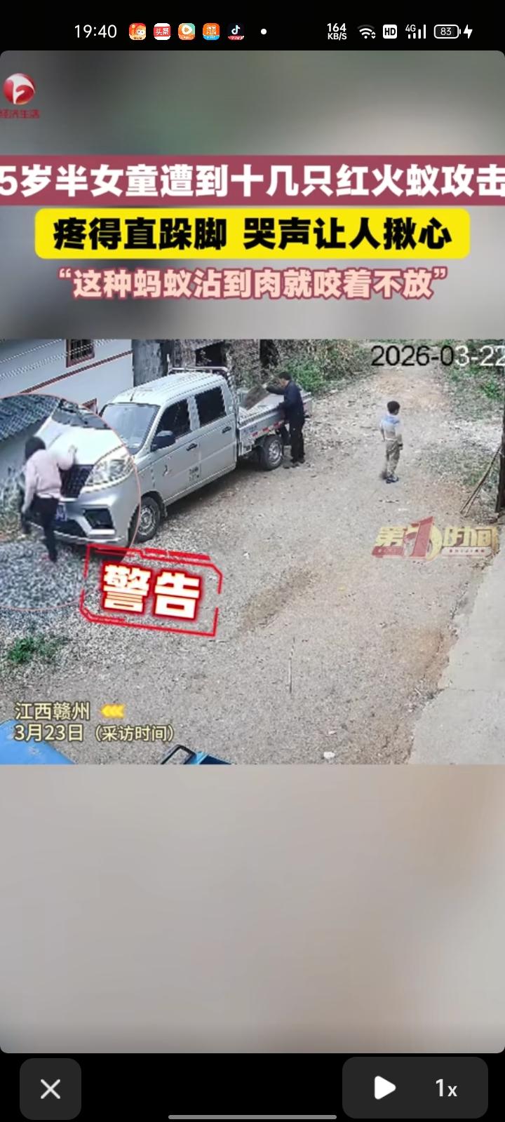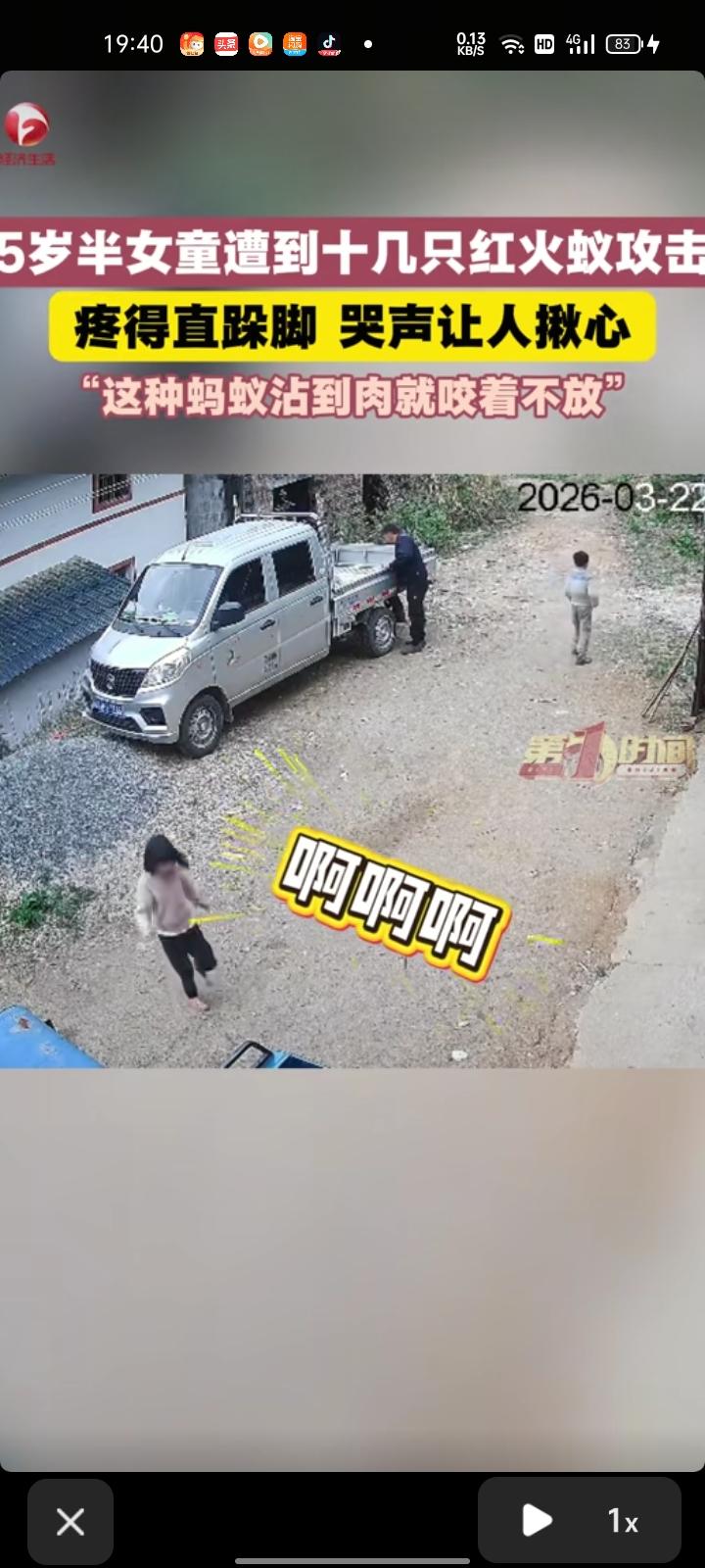 3月22日,赣州市信丰县。网友晒出监控视频,五岁半女儿遭到十几只红火蚁攻击,疼哭得直跺脚,自己干活时就听到哭声了。看着女儿被咬伤的脚,还挺严重的,红火蚁只要沾到一丁点肉就开始咬,经过药物治疗,目前已在恢复中。