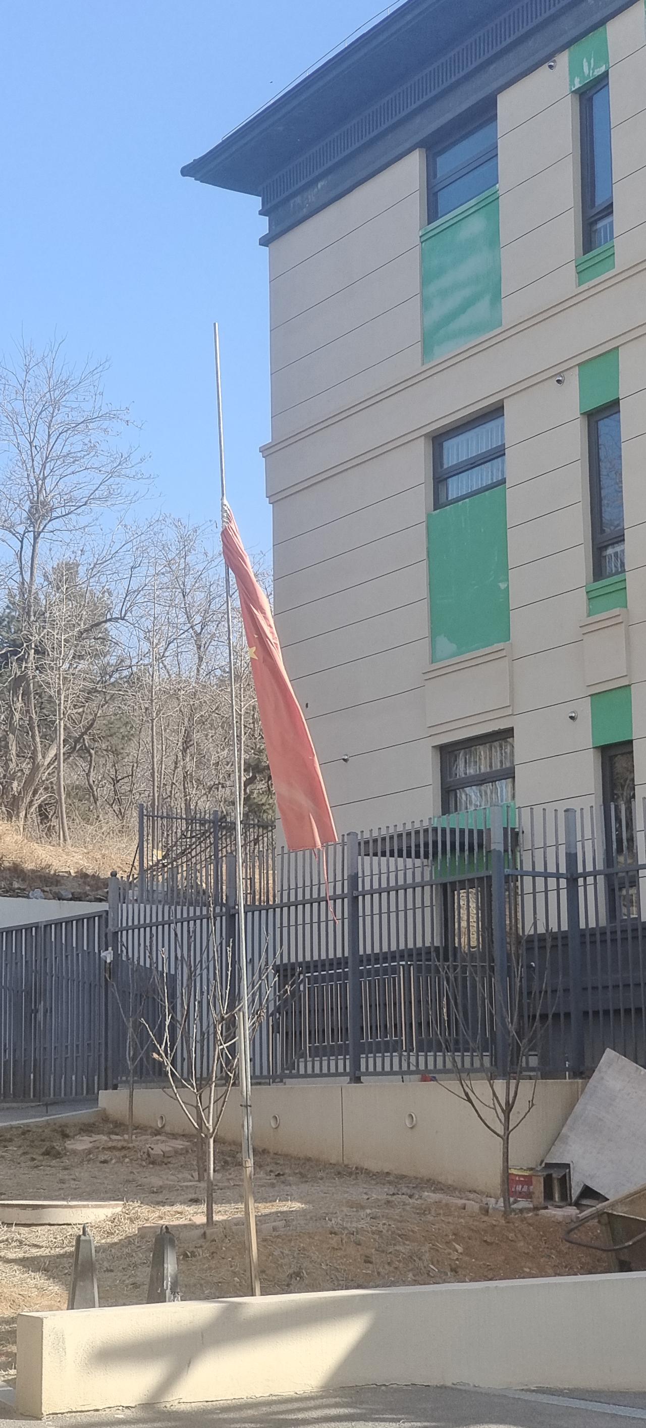 但这国旗太旧了,而且风吹后几乎是下半旗了。很不雅,也不严肃。不符合《国旗法》,我天天看,总觉不劲儿,怎么看都觉得问题不小。