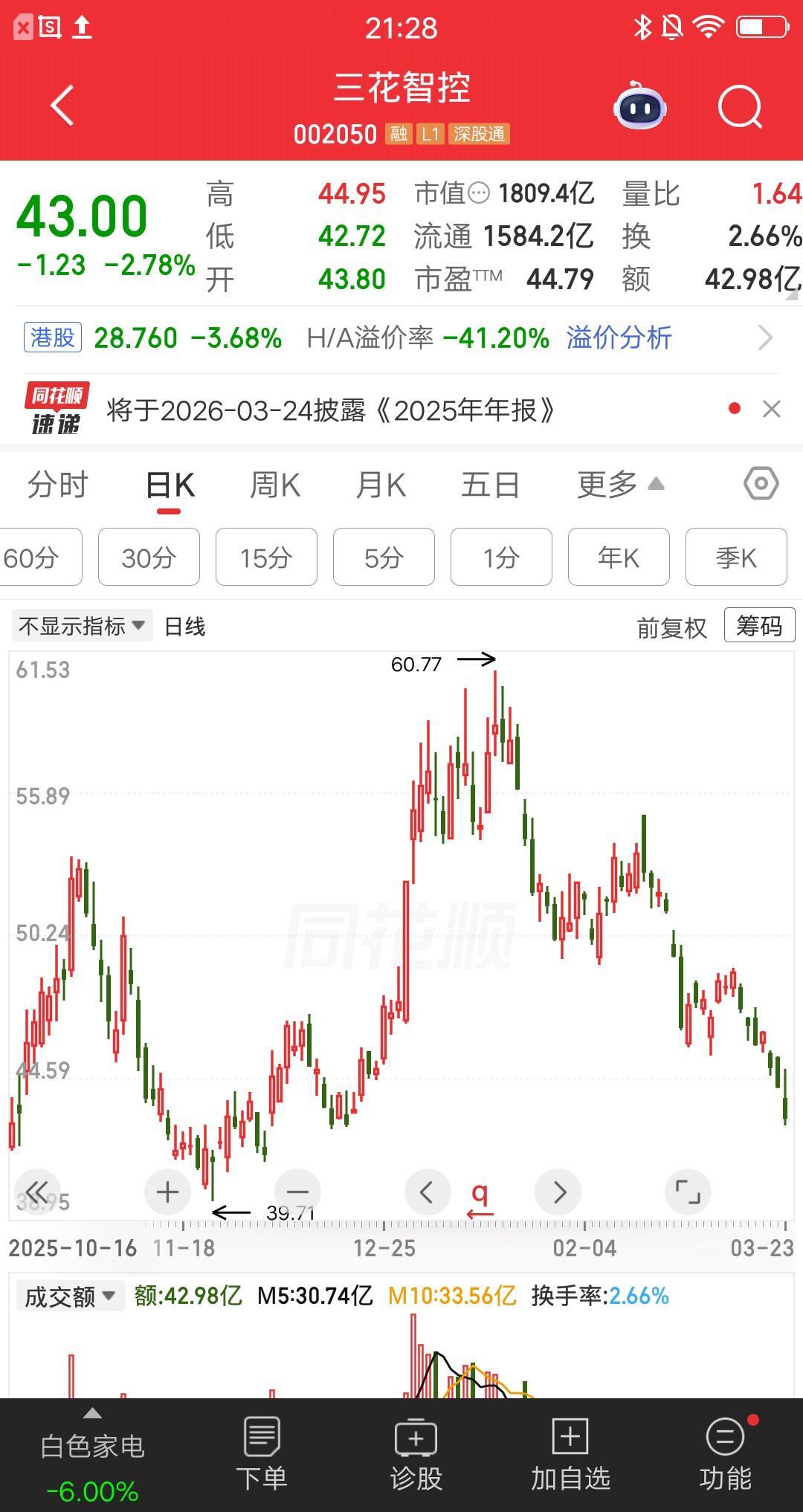 三花智控,2025年营业收入310.12亿元,同比增长10.97%;净利润40.63亿元,同比增长31.10%。既增收又增利,说明公司发展势头良好。 新能源汽车热管理是核心增长引擎,家电业务提供稳定基本盘,机器人与液冷业务打开长期成长空间,成本与费用管理让净利润增速明显大于营收增速。 利润分配方案,每10股分红2.8元,分红总额为11.76亿元。连续分红超过20年,分红水平在A股整体中属于稳健成长型。 每股净资产7.545元、每股经营现金流约1.21元、每股收益1.03元,目前股价43元,总市值1809.4亿。 60.77元是历史最高股价,目前下跌超过25%,依旧处于高位。警惕高股价泡沫风险,切勿追高。