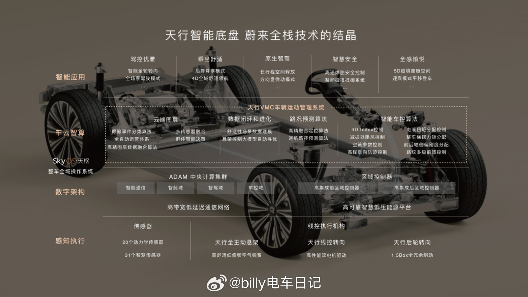 所以后来 ET7的时候,蔚来就开始自研底盘域控制器,把控制权拿在自己手里;再到了 ET9,则进一步上了全主动悬架和线控转向,大家看到香槟塔的震撼感,感叹中国人也能造出这么优秀的智能汽车!