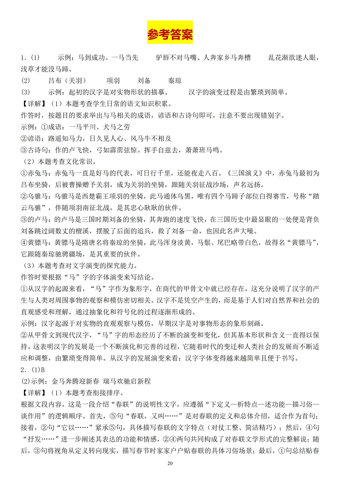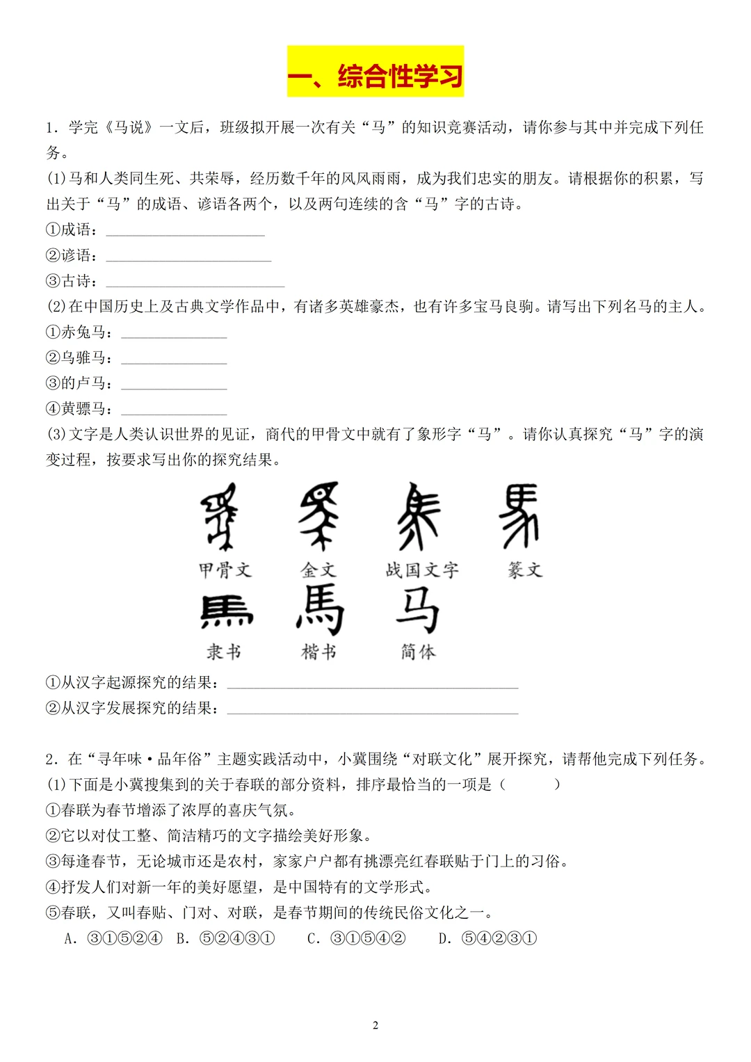 包含关于马的成语、谚语,名马的主人和“马”字的演变,马”的对联、宣传标语等多种题目,兼顾积累与应用,孩子们做这类综合性学习题时一定要做好积累,刷好这些题,基本上能应对所有的马元素相关综合性学习题。