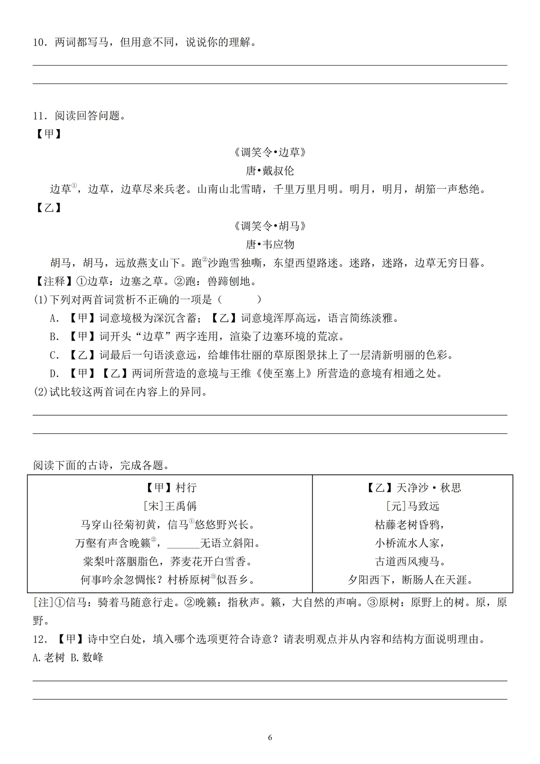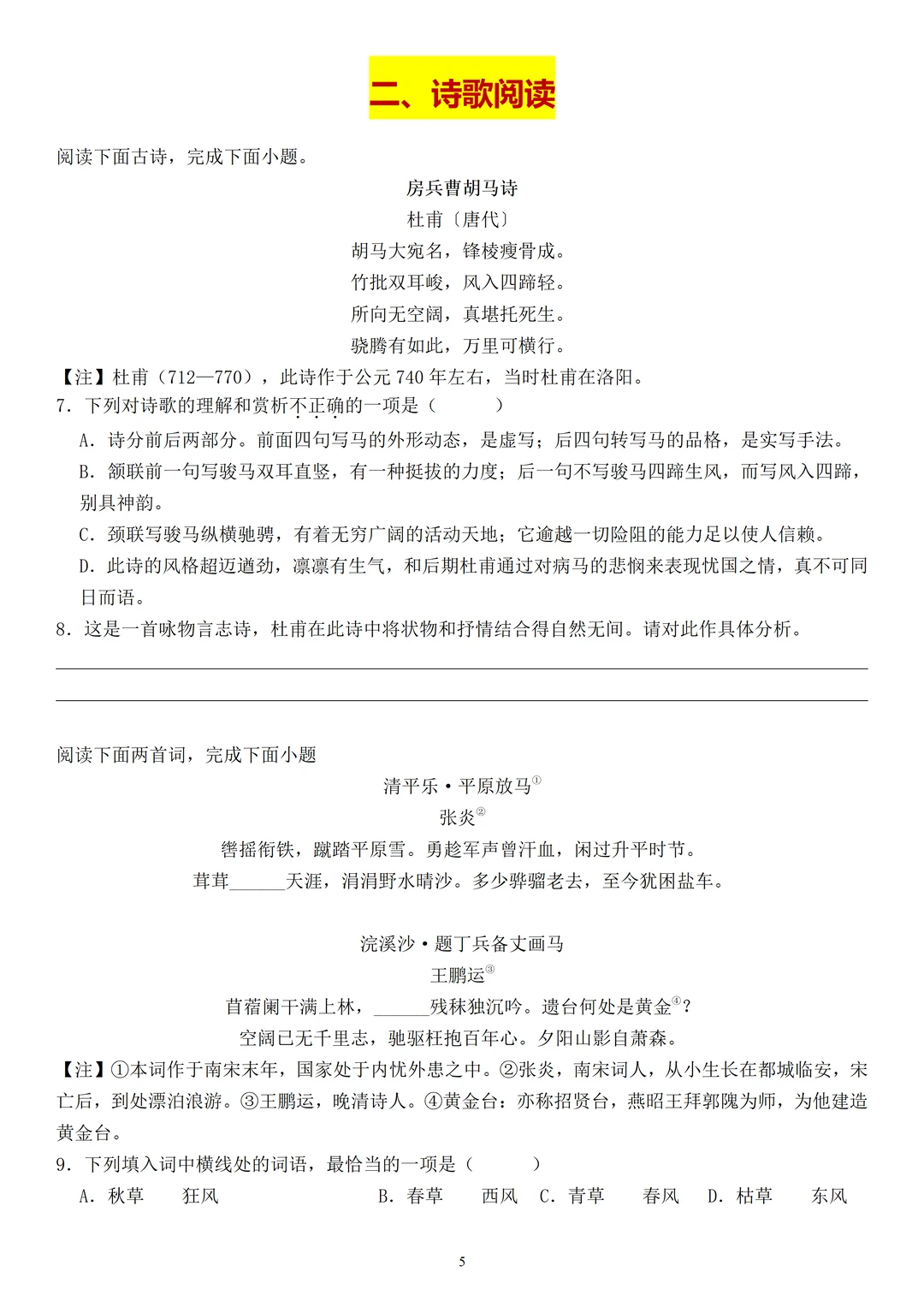 考试可能会出现李贺的《马诗》、杜甫的《房兵曹胡马诗》、张炎的《清平乐·平原放马》与王鹏运《浣溪沙·题丁兵备丈画马》与马有关的古诗等,提前熟悉篇目,考试遇到就不慌。