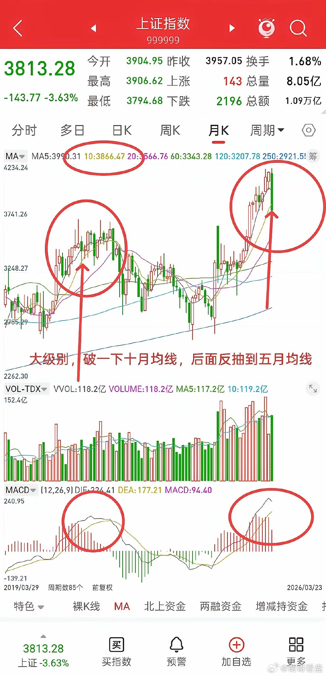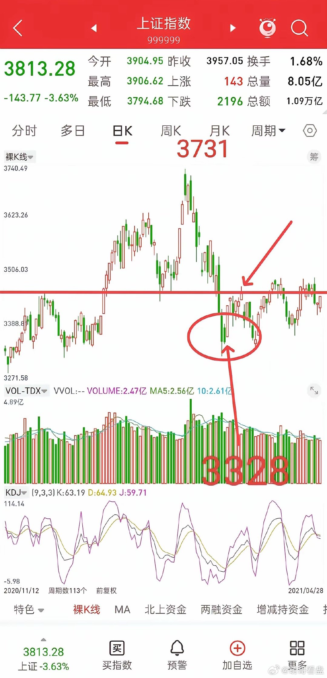 A股,今日放量下跌,是底部信号还是下跌中继,后市走势又会如何?给大家分享一下,关于后市,我的看法,可以参考:复盘一下,当前的走势很像2021年3月份,当时大盘从3731,一路下跌,跌到最低点3328,跌幅403点,3.9号见底3328,第二天大幅高开,但是低走,低点没有破3328,第三天中大阳线,后面第一波反弹有150点。而当前,这一波下跌,从4197,跌到今天最低点3794,跌幅也是403点,今天这个3794是不是本轮低点,不确定,但是,我想说的是:如果明天大盘大幅高开,比如高开30点以上,然后盘中如果冲到十月均线压力位3866附近,短线可以减个仓,下来再接,比如下到3820附近再接,这是短线,如果中线,可以不用动,拿到缺口3950附近,差不多也是150点反弹。目前月K线,十月均线是3866,五月均线是3990点,接下来不排除,行情会反复,后面甚至还会接近4020附近,也就是突破一下五月线,但是这期间会有反复。当然,以上是大盘反弹的看法,而大盘的风险在哪,那就是明天的低点,以及收盘价,如果明天一整天行情都在今天的低点之上,那就很可能见底,如果明天还有低点,且收盘价收在今天收盘价之下,那就要谨慎。大家觉得这可能是刻舟求剑,但是,有时候主力操盘手段,基本都是反人性的,就比如2021年3月,3731那波,一直跌到3328,跌了400点,都以为见底了,结果第二天,高开低走,收个阴线,第三天才是中大阳线。这个市场,就是这样,你明知道行情要见底了,但是主力会想尽一切办法,让大部分人明知道见底,但最终还是割在最低点,让大部分人看不到后面的那根大阳线。这也许就是人性之间的博弈。