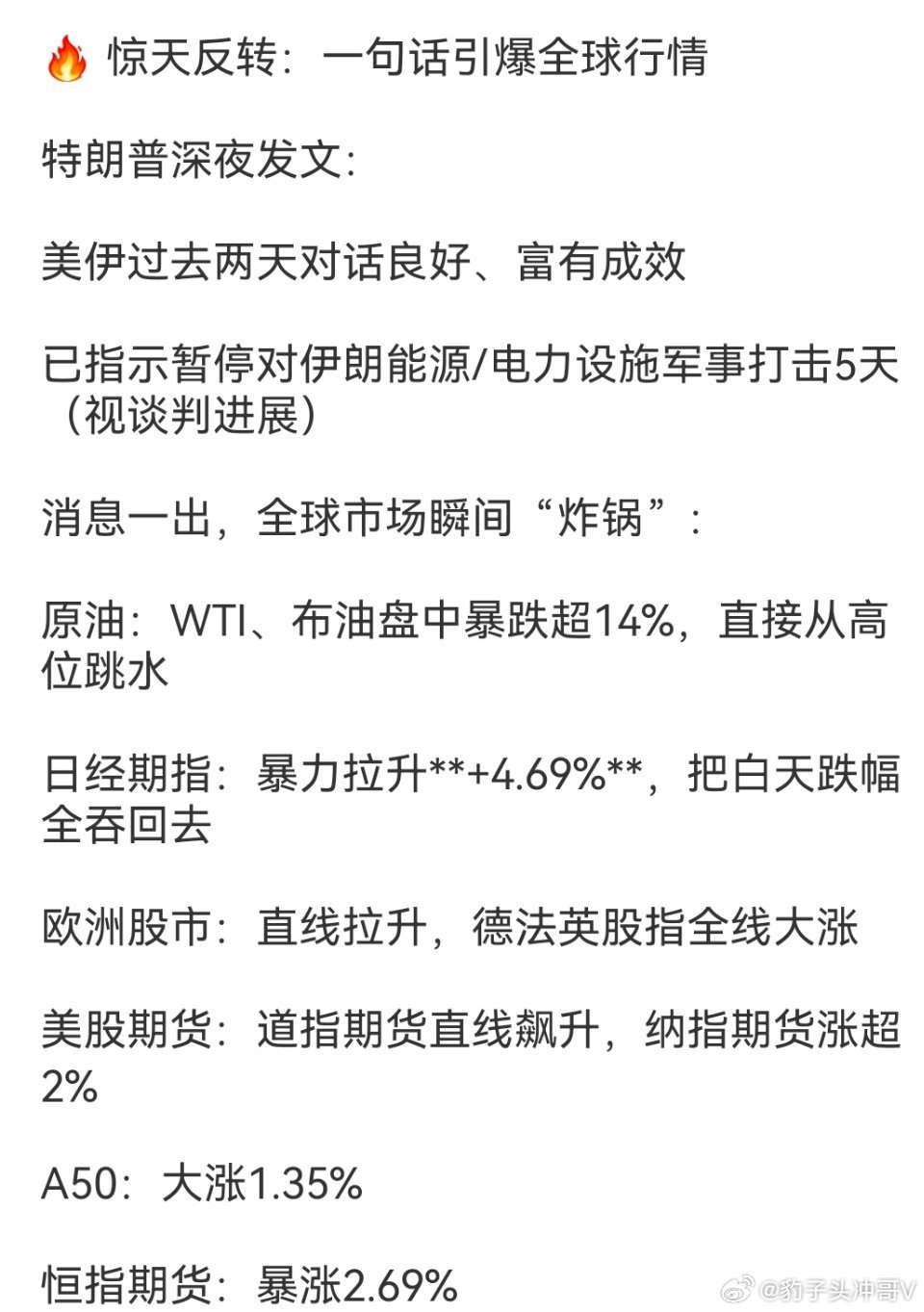 美股三大股指期货突然拉升一句话炸翻全球!美伊不打了?原油狂跌14%,全球股市暴力回血!