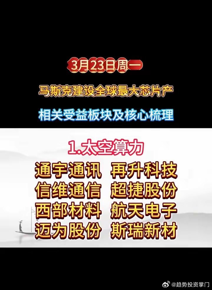 3月23日|马斯克全球最大芯片产业受益板块1. 太空算力:通宇通讯、再升科技、信维通信、超捷股份、西部材料、航天电子、迈为股份、斯瑞新材2. 太空光伏:迈为股份、协鑫集成、捷佳伟创、钧达股份3. 芯片制造:中微公司、北方华创、长川科技、长电科技、通富微电、世运电路、江丰电子、华天科技4. 半导体材料:天通股份、长电科技、横店东磁、世运电路、沪硅产业、美利信5. 先进封装:长电科技、通富微电、晶方科技、太极实业、利扬芯片、深科技
