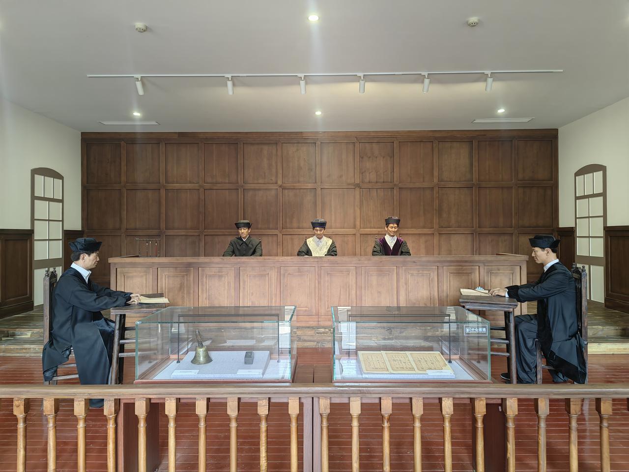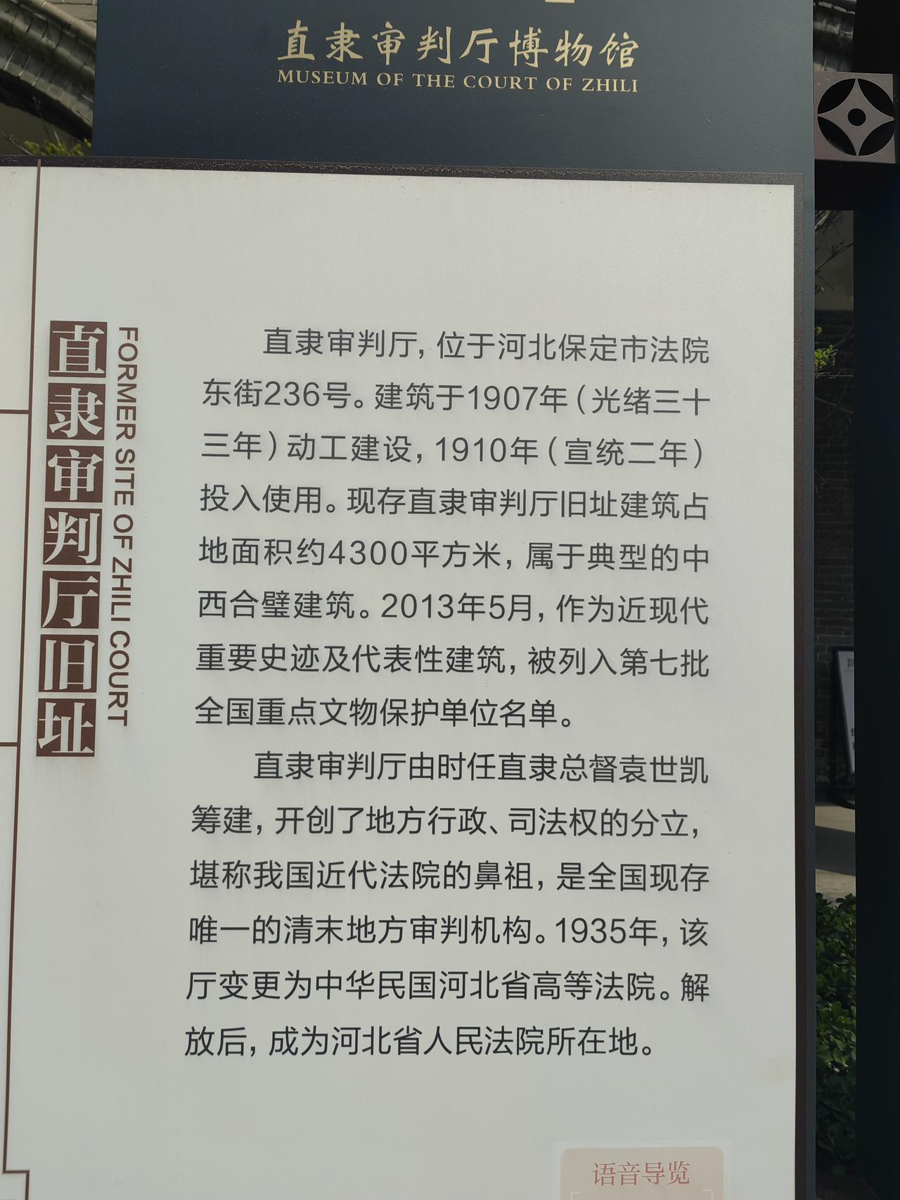 保定古城,在市区内有好多博物馆,有保定市博物馆,古生物博物馆,水利博物馆,这些都是大的博物馆,好多人不知道在双彩小区竟然还藏着一个小博物馆,这个博物馆是以记录中国法律法规进程为内容的博物馆,尤其中国最初的法庭审判建设,直隶审判庭。 直隶审判庭是由保定市中级人民法院主办,展陈面积1251平方米,二层环形小楼主集收藏陈列展示为一体的综合性司法主体博物馆,基本陈列直隶高等审判庭与清末法治改革、民国高等审判庭的建设和运行等,还有新中国第一贪腐案,还有杨三姐真实案例介绍,体现了直隶审判庭在中国法制史的重要地位和深远影响。 博物馆采用蜡像人物展示,图片展示,模拟实景,显得生动有趣,博物馆虽在闹市小区,但闹中取静,难得一片宁静。在廊墙上有一条标语,不知是博物馆建设的时候故意留下还是没有处理干净“耿武掌权一年,大砍工宣队,是拉倒车,是复辟,是回潮”,不知意思,不知耿武是谁,但一定有故事。