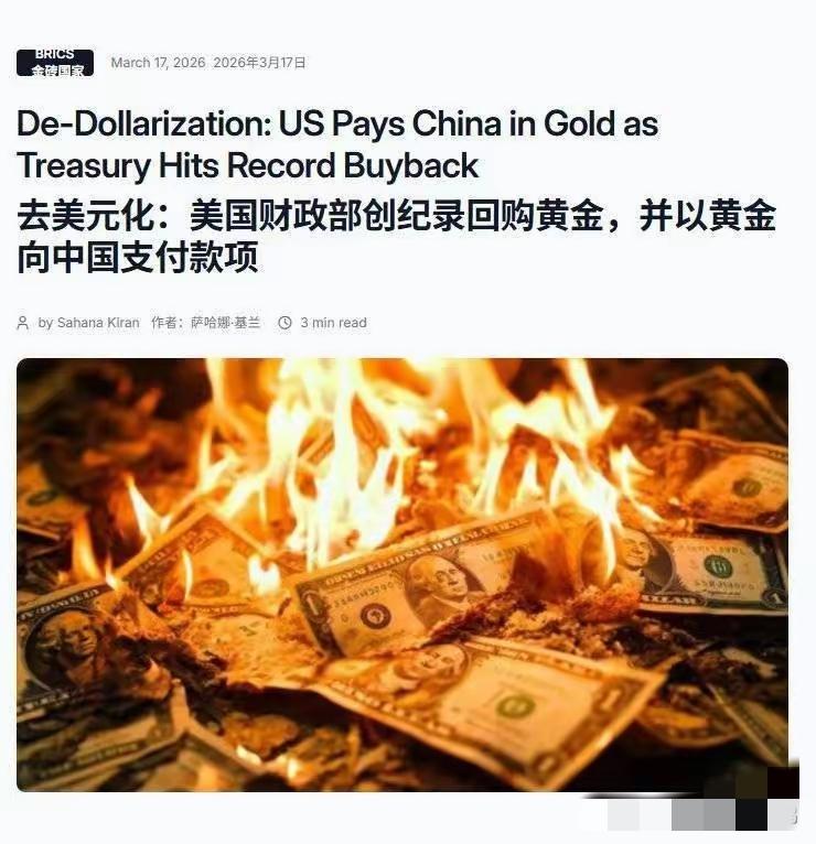去美元化:美国财政部创纪录回购黄金,并以黄金向中国支付款项。 正如局座当年预言的,美国只要输掉一场中型战争就会沦为第三世界国家。而这个预言正在以我们肉眼可见的趋势慢慢应验。 这话搁在十年前,说出去谁信?那时候美元还是全球公认的硬通货,谁敢质疑它的霸主地位,就跟挑战太阳从东边升起一样荒唐。可眼下美国财政部自己都开始大规模回购黄金,甚至拿黄金来跟中国结算,这哪是什么金融创新,分明是在给自己找退路。 黄金这东西,人类用了五千年都没淘汰,因为它不讲信用、不靠霸权,纯粹就是硬通货。美国现在手里攥着全球最多的黄金储备,这时候拿出来用,说白了就是美元的信用已经撑不住了。2024年美国国债突破34万亿,光利息支出就超过军费预算,这账怎么算都填不平。 有人会问,美国那么强大,怎么可能一夜之间就垮了?这可不是一夜之间的事。局座说的“输掉一场中型战争”只是个引爆点,真正的根子在美国这些年过度透支霸权。打仗花了几万亿,制裁别人把自己也制裁疼了,加上国内两党撕扯、债务无上限,这一桩桩一件件都在掏空美元的底气。 拿黄金跟中国结算,这事儿的象征意义太大了。中国连续好几个月减持美债,增持黄金储备,现在手里黄金超过2200吨,摆明了是在调整资产结构。美国不是傻子,能这么干,说明他们自己心里清楚,光靠印钞机已经镇不住场子了。 想想也挺讽刺的。美元当年是怎么上位的?靠的是二战后美国手里占全球四分之三的黄金储备,布雷顿森林体系一纸协议,美元就跟黄金挂上了钩。后来1971年尼克松关了黄金窗口,美元纯粹靠石油、靠航母、靠美国信用撑了五十年。现在信用这张底牌也快要翻不动了。 可别指望美国会乖乖走下神坛。他们这一波操作,明面上是回购黄金、优化资产负债结构,暗地里很可能是在布局一个新的货币体系——以黄金为锚,拉上盟友搞封闭圈子。这跟当年英镑衰落时,英国搞英镑区的套路一模一样。历史不会简单重复,但韵脚总是惊人的相似。 咱普通老百姓看这些事,别觉得离自己太远。美元要是真崩了,全球资产价格、大宗商品定价、外汇储备安全,哪一样不牵动着饭碗和口袋?不过有一点可以放心,中国这些年提前布局——人民币跨境支付系统、数字人民币、与多国本币互换协议,都是在风暴来临前加固自己的船舱。 局势确实在变,而且变得比我们想象的要快。美国这个曾经的全球霸主,正在用黄金这种最原始的方式给自己兜底,这本身就够说明问题了。至于局座那个预言会不会完全应验,咱就等着瞧吧。 各位读者你们怎么看?欢迎在评论区讨论。