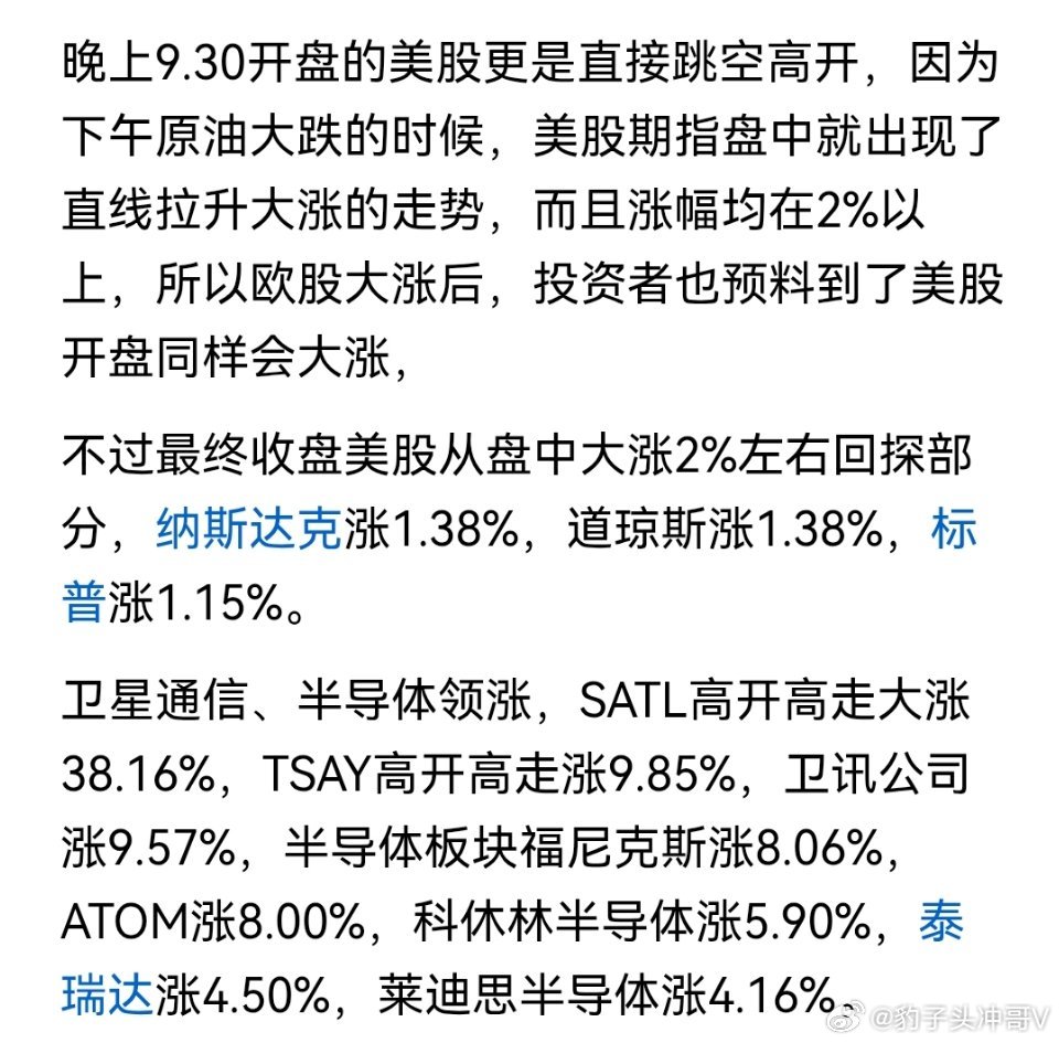 金价大跌没人扫货了大逆转,原油跌,欧美股市大涨,卫星通信半导体领涨,中概股普涨