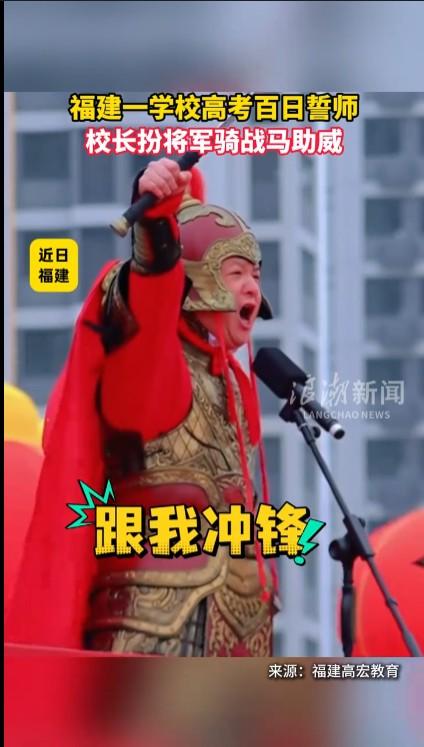 福建一中学在高考百日誓师大会上,身披金色铠甲、手拿长剑、骑着高头大马表演,不知道租用这些服装、马匹等道具是自己租的还是用的公款?如此装扮给自己好好过了一把瘾,而把全校师生和家长当成了配合演戏的道具,确实不妥。很多形式的东西有激励作用,但过火了就成了劳民伤财和形式主义,就看家长和学生怎么看了。
