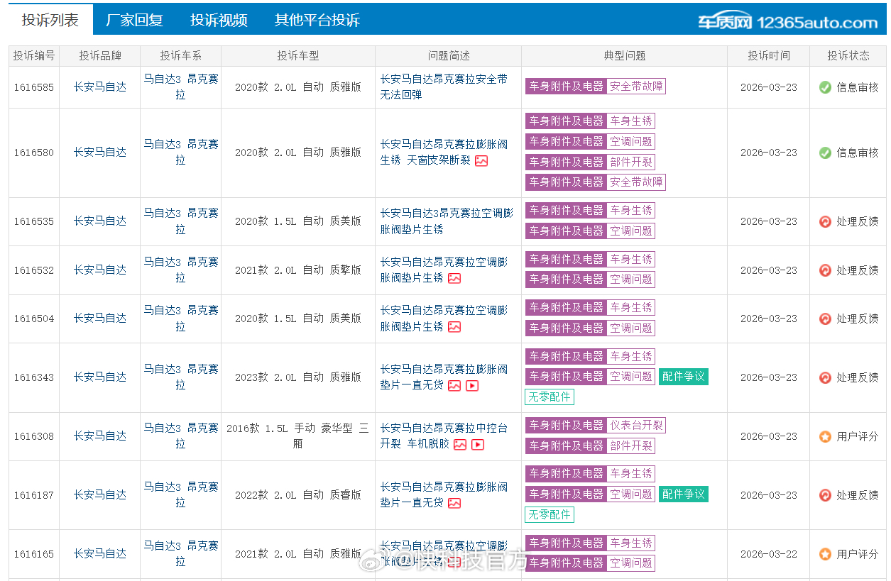 【马自达昂克赛拉部件生锈遭集体投诉!车主:4S店一直以无货拖延】第三方汽车投诉平台车质网显示,最近7天,长安马自达3昂克赛拉遭到车主们的集体投诉,投诉原因普遍为“空调膨胀阀垫片”生锈,涉及车型多为2020款-2023款车型。投诉车主称,他联系过4S店两次,4S店方面均说没有配件到货,需要等通知。