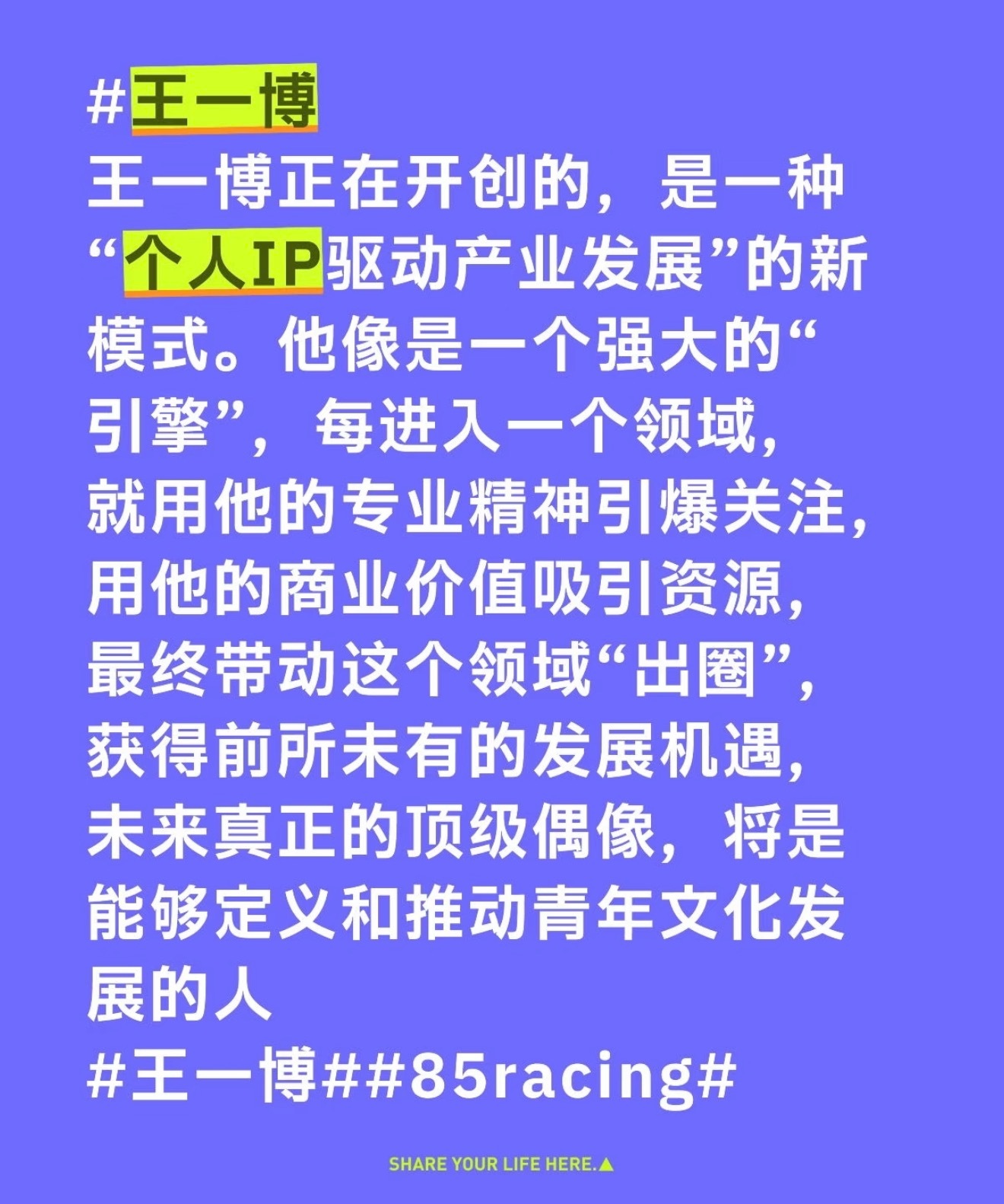有人说一博是预言家开金手指了提前打造个人ip王一博虽然个人ip很明显,个人标签也很突出,比如摩托、赛车、滑板、攀岩、攀冰、街舞……但他仅仅只是遵从本心,深耕自己热爱的事情,一直默默地在努力,实在是实力不允许低调,干一行行一行,渐渐地形成了现在的个人ip,而不是专门为了这个目的而打造的,出发点仅是悦己越己阅己。