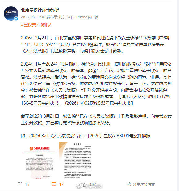 恭喜虞书欣维权成功,造谣必惩,管不好自己的嘴活该被告哦。