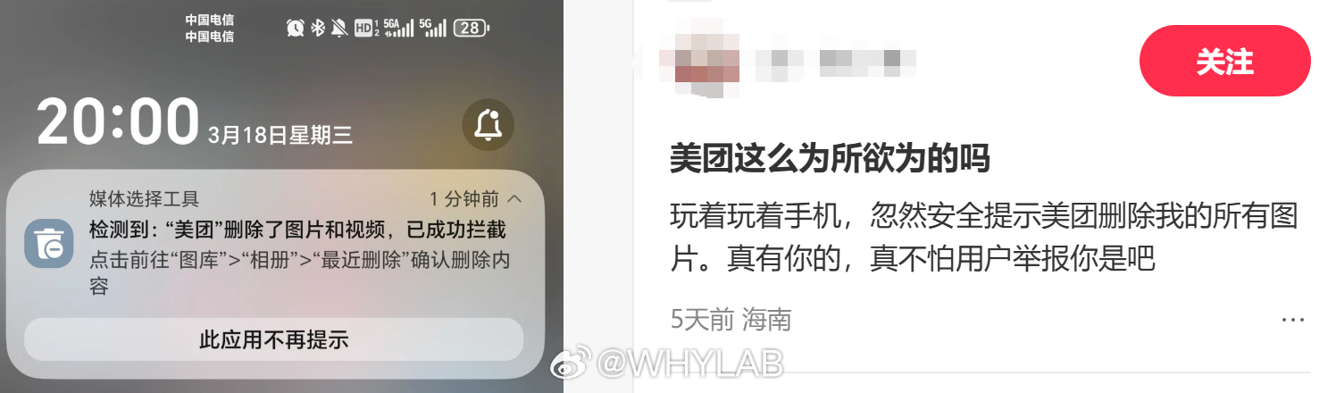 美团删照片App为什么能随便删我相册这事我是真没遇到过,但上网一搜才发现不是个例