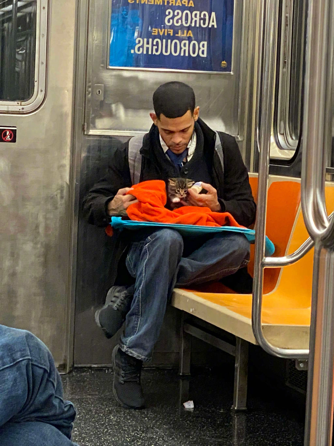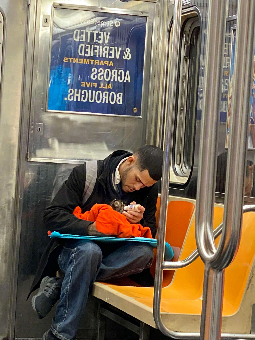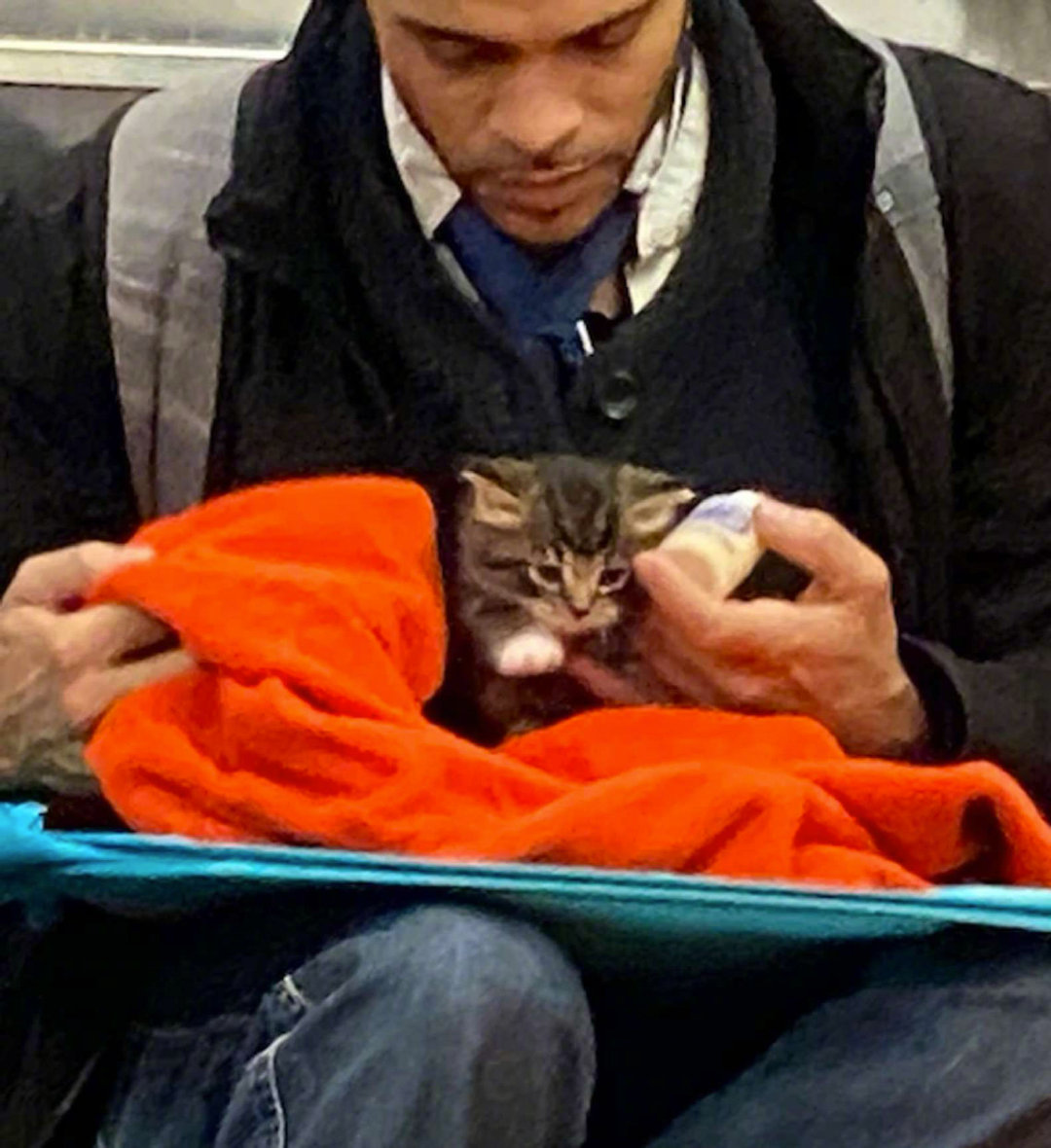 我们的世界充满爱!不久前纽约网友GillianRogers搭地铁外出时,看到一名男子手里拿着一条毛毯,还有一个小奶瓶。Gillian非常好奇,就观察了一下,这才看清楚毯子里竟裹着一只小奶猫。男子和小奶猫的对比太强烈,那一刻Gillian觉得非常温馨、有爱。