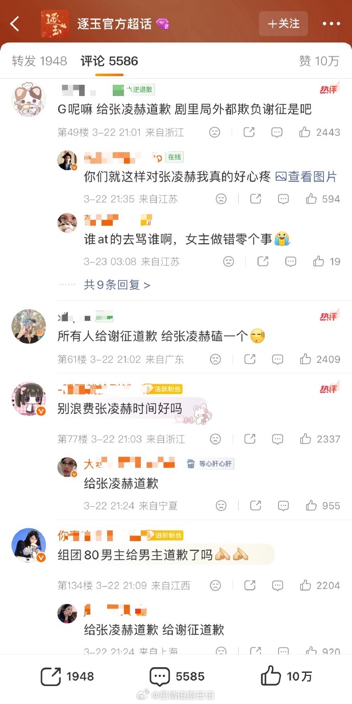 张凌赫粉丝在逐玉官博维权要求田曦薇道歉