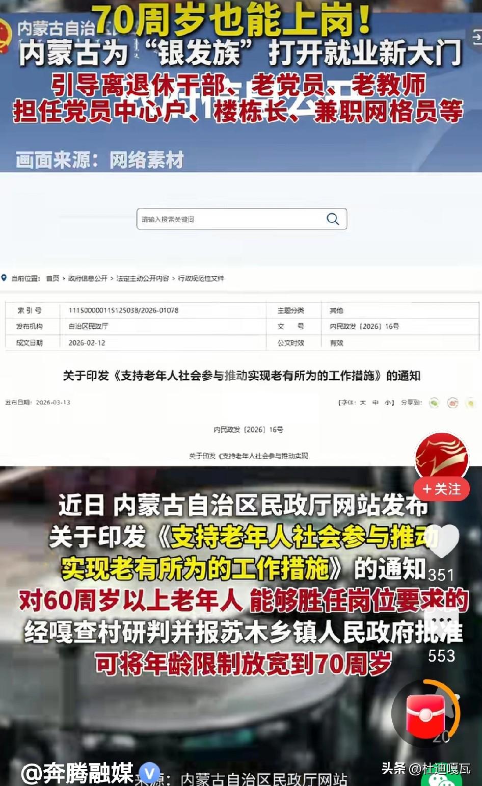 在内蒙古,70周岁的老人也能上岗工作了! 根据当地的支持老年人参与工作的通知,离退休干部老党员,老教师等可以担任党员中心户,兼职网格员等这些职位。 这样做的目的就是为了创造多样化,个性化适合老年人的岗位,并要求用人单位必须保障老年人的劳动报酬,休息休假等职工权益。 有网友说,这个措施挺好,一些心有余力的退休老人还可以继续发光发热,不但能增加收入,还能让自己的晚年生活更加的丰富。 也有网友说,现在40,50没有退休的人,工作也比较麻烦,是不是应该优先考虑这些没有正式工作的,毕竟退休的群体还有退休金,而这一部分人还要挤出一部分钱来自己交社保,人家说哪一种方案更加的能解决大众的困难呢?