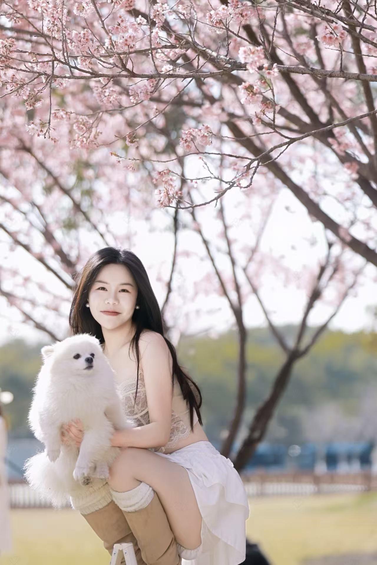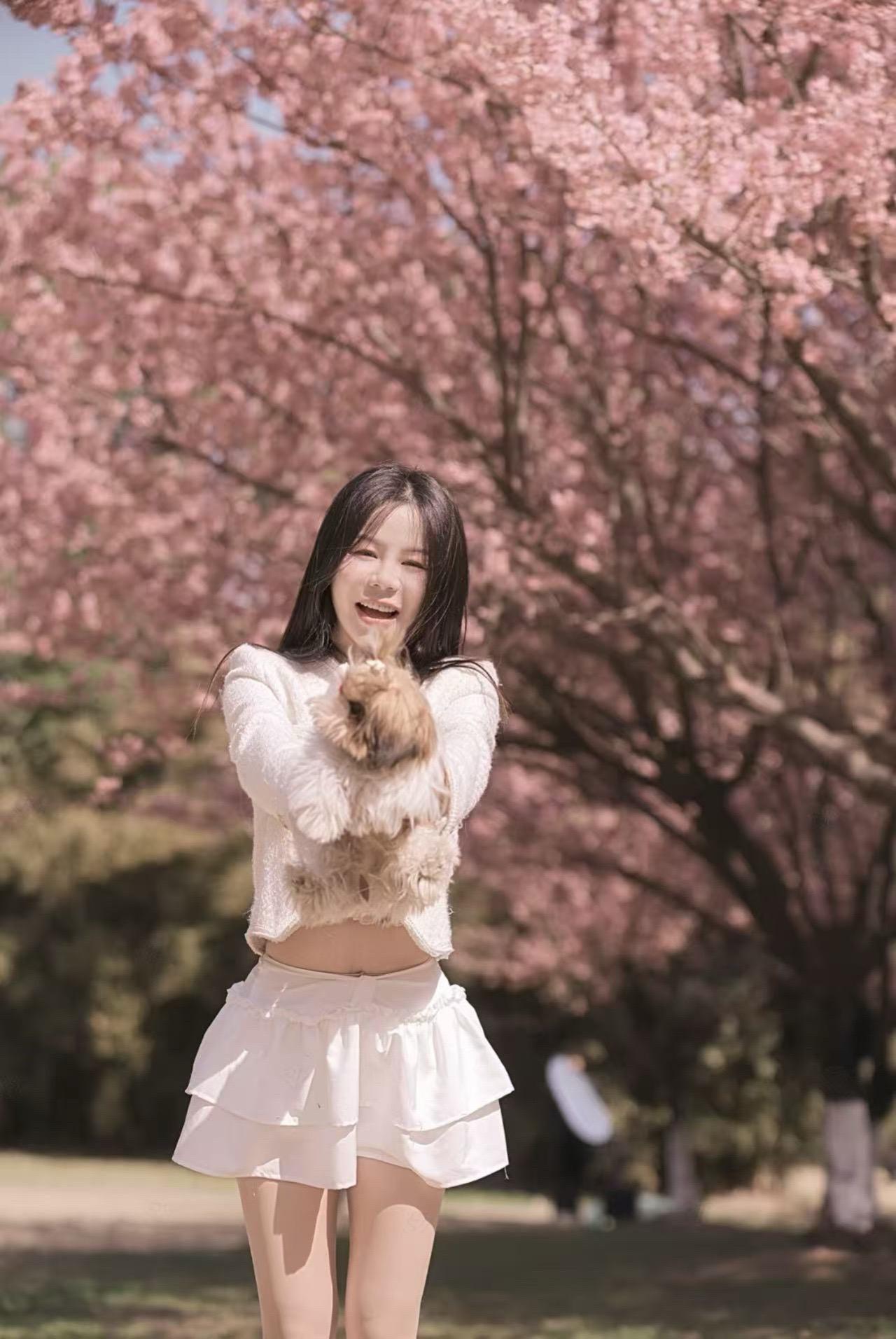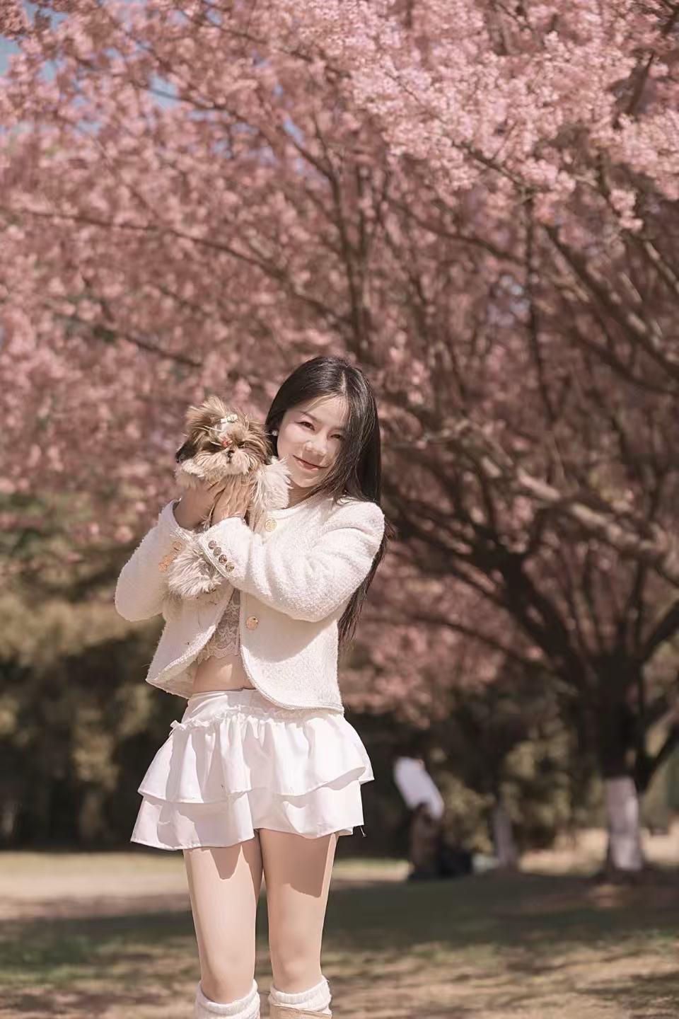 樱花季甜妹穿搭 小狗 西施犬 樱花 摄影