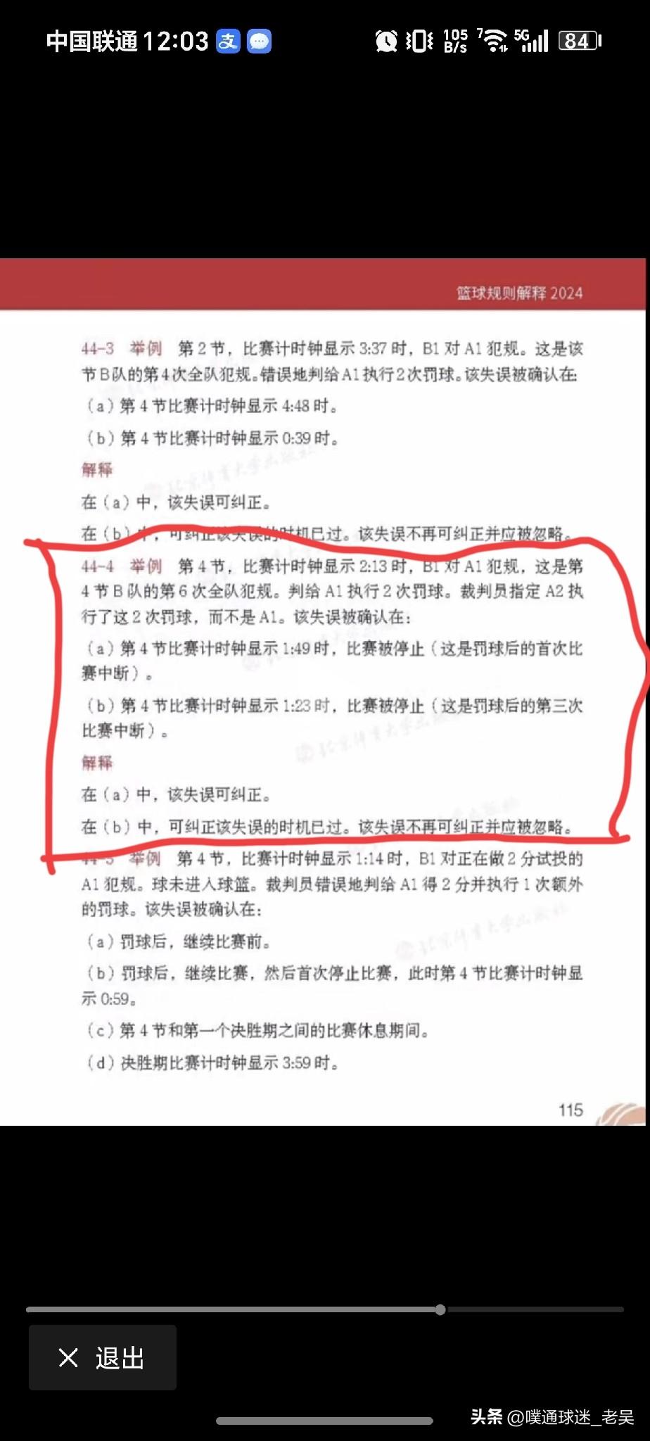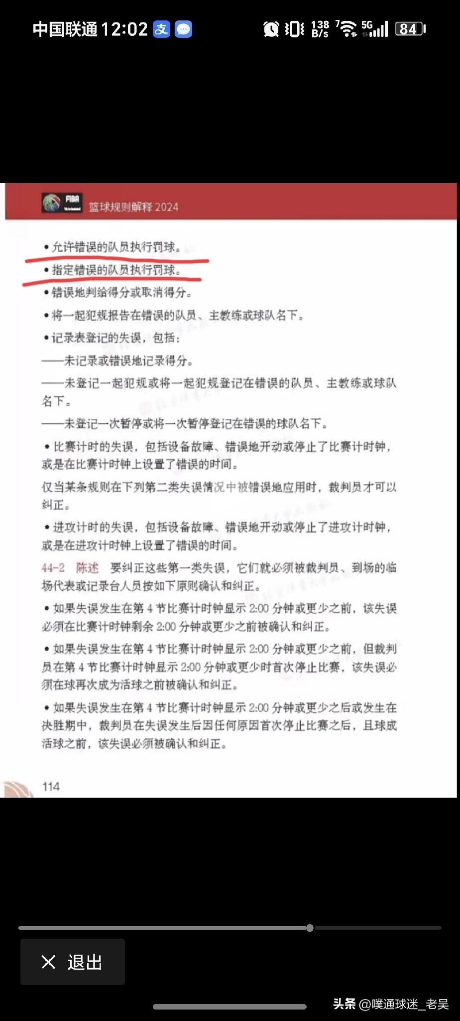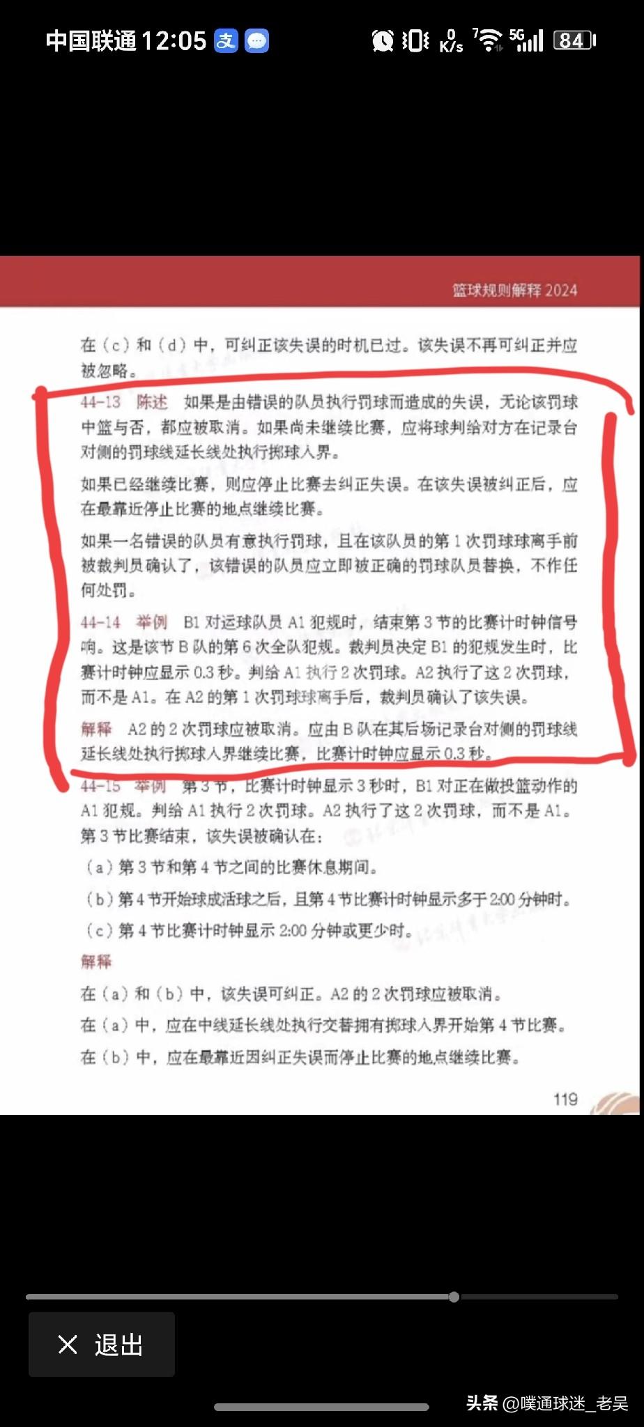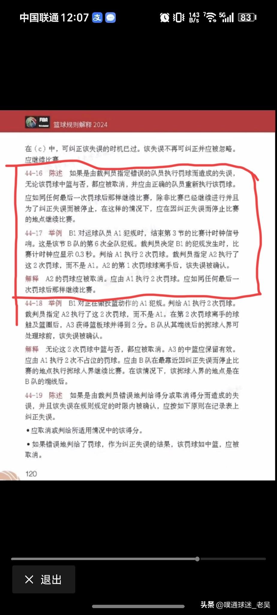 2026年3月23日晚间CBA的一场比赛,辽宁男篮主场迎战南京同曦,在第四节最后时刻,出现了一个有争议的判罚。 根据查询,规则如图。 适用这个争议判罚的规则似乎有两条。 一个是取消鄢手骐罚篮得分,判给南京球权;一个是取消鄢手骐罚篮得分,改由莫兰德罚篮,然后按正常罚篮后规则继续进行比赛。 经过仔细分析,我觉得昨天的判罚应该遵循后一项规则,即由莫兰德重新罚篮。 区别点如下: 1-两条规则不同之处在于是否由裁判员指定了错误的球员进行罚篮。 2-前一个规则提到,错误球员第一次罚篮球离手后,裁判需要确认这个失误;而后一个规则提到,错误球员第一次罚篮球离手后,该失误(即裁判员指定了错误球员罚篮)被确认。 3-根据昨晚现场情况,鄢手骐两次罚篮结束后,是因为南京队提出来质疑,裁判才进行回看改判!而裁判员并没有在鄢手骐第一次罚篮球离手后,确认失误! 综上所述,昨晚裁判员纠正了一个错误,又制造了一个错误!