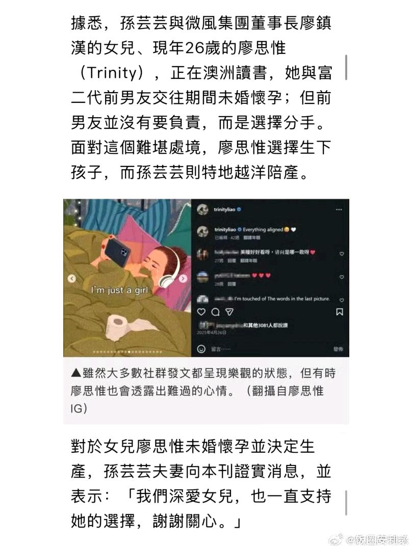 47岁孙芸芸当外婆炸翻豪门!女儿未婚生子被富二代抛弃,她的回应太圈粉 台湾第一名媛孙芸芸,47岁就悄悄升级当外婆了,这消息一出,直接把台湾豪门圈炸翻了! 她26岁的女儿廖思惟,顶着新一代“最美名媛”的名头,却没走妈妈嫁入豪门的老路。 廖思惟2021年去澳洲留学时,和一位华人富二代相恋,2023年还公开了恋情。可意外怀孕后,男方直接翻脸不认人,孕期就提了分手,之后更是彻底失联。没想到廖思惟愣是咬着牙,独自在澳洲把孩子生了下来,当起了单亲妈妈。 整个孕期她把消息捂得严严实实,社交平台发的全是提前拍好的美照,看着依旧纤瘦时髦,网友愣是一点没看出来,直到孩子平安落地,她才突然官宣了这个消息。 面对这事,孙芸芸夫妻俩没半句指责女儿的话,只对外轻飘飘说了一句:“我们深爱女儿,也一直支持她的选择,谢谢关心。” 消息一出,网友直接吵翻了天。 有人酸溜溜地说:“人家家底厚,就算未婚生子也不愁养,我们普通人就别瞎操心了。” 也有人替她惋惜:“本来能顺顺当当嫁顶级豪门,这下彻底没机会了。” 还有人一眼戳破重点:“47岁当外婆有啥稀奇的,人家21岁就生了她,比女儿生孩子时还小5岁呢!” 说实话,这事最难得的根本不是孙芸芸多有钱,而是她对女儿的尊重。 多少豪门把家族面子看得比孩子的幸福还重,未婚生子这种事,恨不得逼着女儿放弃孩子保全体面,可孙芸芸偏不。她自己活成了名媛模板,却没逼着女儿按她的人生剧本走。 说到底,人家自己就是顶级豪门,女儿根本不需要靠婚姻攀高枝。有家里兜底撑腰,想怎么活就怎么活,这才是真的名媛底气。