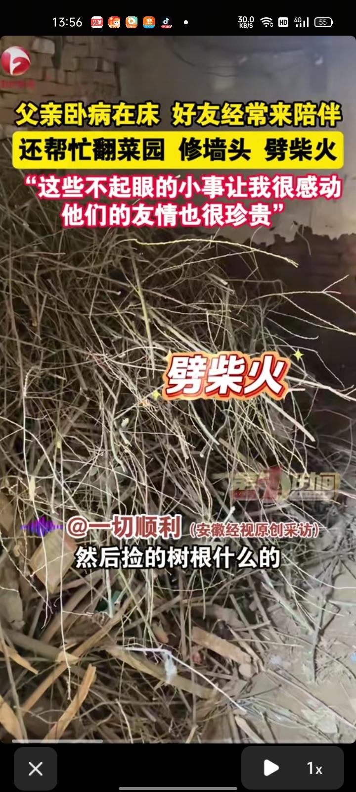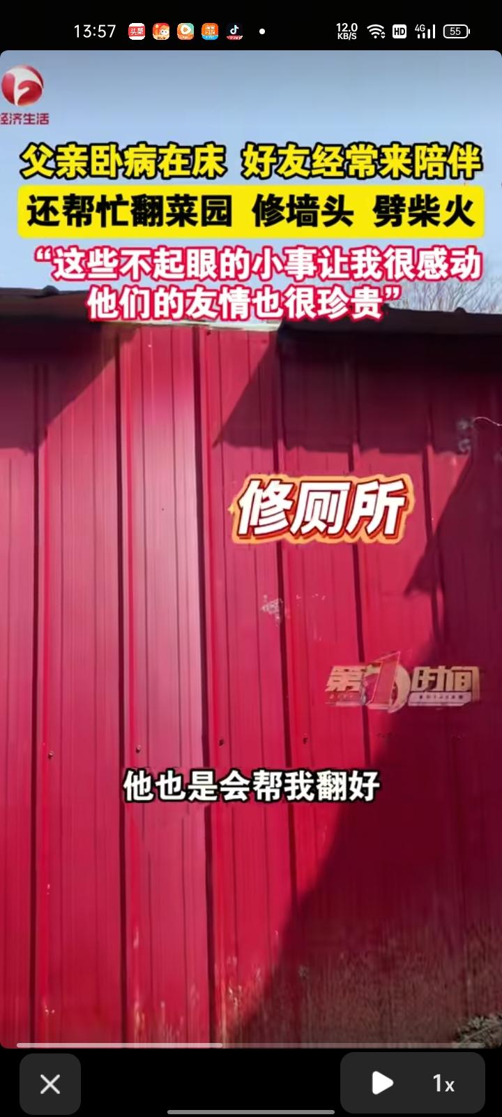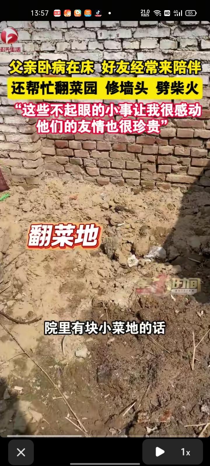 3月23日,安阳市内黄县。网友发视频表示, 父亲常年卧病在床,比他小20岁的朋友经常来陪伴,除了跟他唠嗑外,还帮忙翻菜园、劈柴火、修墙头。这些不起眼的小事让自己很感动,他们的友情虽然肉麻,但珍贵。