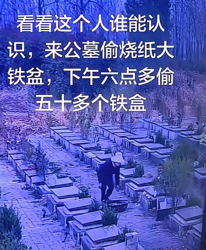 清明节快到了,公墓烧纸的铁盆丢了,被偷走五十多个,这不是里外得罪个遍? 近期某公墓发生盗窃事件,用于烧纸的铁盆被大批偷走,从监控录像上看,偷走铁盆的是个大妈,戴着帽子,趁天色渐黑之时潜入公墓偷走了铁盆。 铁盆一丢,清明节前来祭祀的人没办法烧纸,这事可就难办了。公墓管理员气得咬牙切齿,工作这么多年,从未遇到过这么离谱的事,大妈为了发财,还真是无所顾忌。