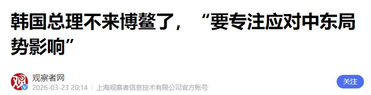 韩总理取消访华,给出一个理由,要先解决燃眉之急? 3月23日,韩联社发布了一条消息,韩国总理金民锡突然宣布,临时取消原定3月24日到27日访华、出席博鳌亚洲论坛的行程。 这可是韩国总理时隔7年,再次有机会出席博鳌亚洲论坛,本来大家都期待着这次访问能促进中韩两国的交流合作,结果却因为韩方的临时调整,让这次机会落了空。 什么急事能让韩国总理放弃这么重要的访华机会呢?其实答案很简单,就是中东局势不稳,已经直接影响到了韩国的国内经济,老百姓的日子受到了影响,企业也遇到了困难,这些事都得总理亲自坐镇指挥,根本耽误不得。 大家都知道,最近中东那边很不太平,伊朗和以色列、美国闹得很厉害,还发生了大规模的军事打击,整个中东的局势变得特别紧张。 可能有人觉得,中东离韩国那么远,怎么会影响到韩国?其实不然,韩国是一个特别依赖能源进口的国家,尤其是石油和天然气,大部分都来自中东。 根据韩方公布的消息,韩国大约70%的原油,还有20.4%的液化天然气,都是从中东进口的,而且这些能源几乎全部要经过霍尔木兹海峡运输。 现在中东局势一紧张,霍尔木兹海峡的航运就受到了影响,韩国的能源供应一下子就变得紧张起来,甚至陷入了恐慌。 早在3月初,美伊冲突刚爆发一周左右,韩国就已经发布了一级能源预警,还把资源安全危机预警级别上调了一级,从最低的“关注”调到了“注意”,可见情况有多紧急。 到了3月中旬,韩国政府更是紧急召开专题会议,决定在未来三个月内,释放总计2246万桶的战略石油储备,就是为了缓解能源供应的压力,这也是国际能源署释放石油储备行动的一部分,韩国的释放量占了5.6%,也能看出韩国能源供应的紧迫性。 更让人着急的是,韩国目前的石油储备量,只能维持208天的需求,再加上民间的储备,总共也才1.502亿桶,比日本的石油储备还少,日本的石油储备能维持254天,相比之下,韩国的能源压力更大,根本耽误不起。 能源供应一紧张,连锁反应就来了,首先受到影响的就是韩国老百姓的日常生活。现在韩国国内的汽油价格一直在飙升,已经突破了1900韩元一升,换算成人民币,差不多是8.7元一升,创下了近四年来的新高。 对于普通韩国老百姓来说,加油变得越来越贵,日常出行的成本大大增加,本来生活压力就不小,现在更是雪上加霜,这也是韩国政府必须优先解决的问题。 除了老百姓的生活,韩国的企业也受到了很大影响。韩国的经济高度依赖对外出口,半导体、石化、汽车等核心产业,都是高耗能产业,对能源的需求特别大,能源价格一涨,这些企业的生产成本就跟着增加。 像三星、SK海力士这些韩国的龙头企业,已经开始启动成本削减计划,调整全球供应链布局,减少高耗能环节的投入,这直接影响到了韩国的出口规模,也让韩国的经济下行压力变得更大。 更糟糕的是,3月23日当天,受中东局势急剧恶化的影响,韩国的金融市场也出现了剧烈震荡。韩国综合股价指数单日跌幅超过6%,盘中一度跌破5400点关口,还触发了临时停牌措施,可见市场的恐慌情绪有多严重。 与此同时,韩元对美元的汇率也大幅走弱,收于1517.3韩元兑1美元,创下了近17年来的新低,老百姓手里的钱变得越来越不值钱,资金也在不断撤离,这些都需要政府及时出手稳定。 除此之外,中东局势还给韩国带来了安全压力。美方为了填补中东的防空缺口,已经调走了韩国的部分萨德、爱国者防空导弹系统,韩国总统李在明也承认,韩方反对但无力阻止。 另外,美国还希望韩国派出军舰,参与霍尔木兹海峡的护航,但韩国并不想卷入中东的战事,也不想激怒伊朗,陷入了两难的境地,这些事情也需要金民锡留在国内协调处理。 韩方也明确表示,这次取消访华行程,完全是出于客观局势的无奈,并不是不重视对华合作。他们已经通过外交渠道,提前向中方充分说明了情况,还请求中方谅解,态度十分诚恳。 毕竟,对于金民锡来说,作为韩国的国务总理,国内的经济稳定、老百姓的生活保障,才是最首要的职责,眼前的这些燃眉之急,必须优先解决,根本没有时间分心去参加博鳌亚洲论坛。