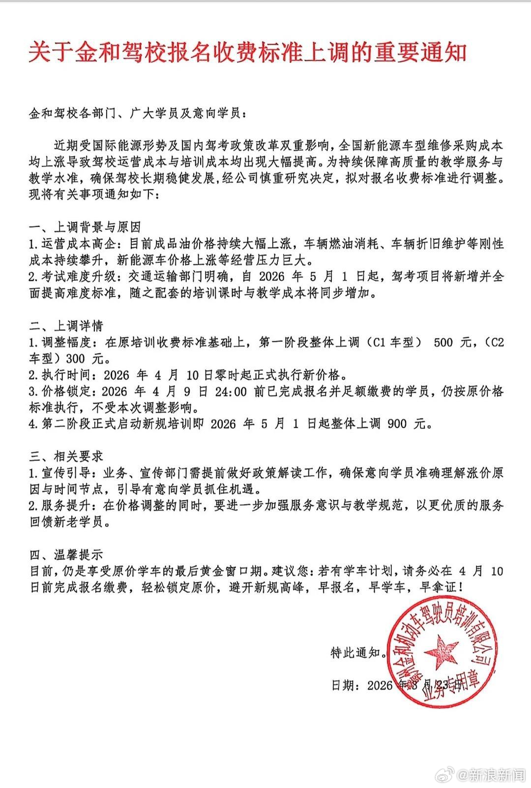 肇庆市深港驾校3月20日也发布通知,称受市场环境以及燃油价格持续攀升且上涨趋势明显的影响,导致驾校运营成本大幅度增加。经公司研究决定自2026年3月26日起,对各班别招生价格进行调整,调整幅度为100元至300元(不同班型略有差异)。