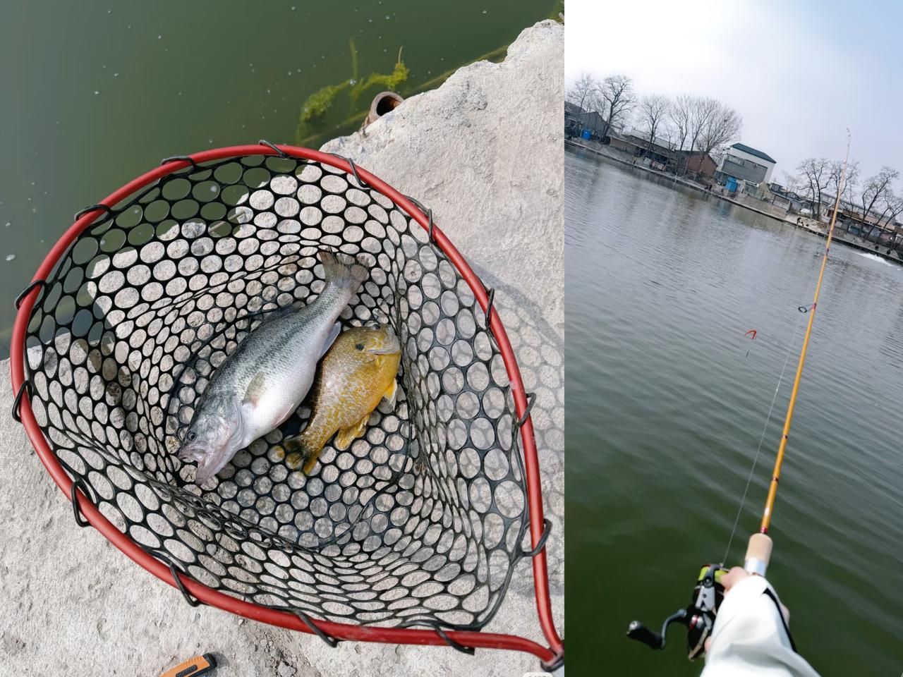 姚安娜穿着休闲, 在湖边钓鱼, 钓了一条小金鱼, 还钓了一条略大一些的小银鱼。