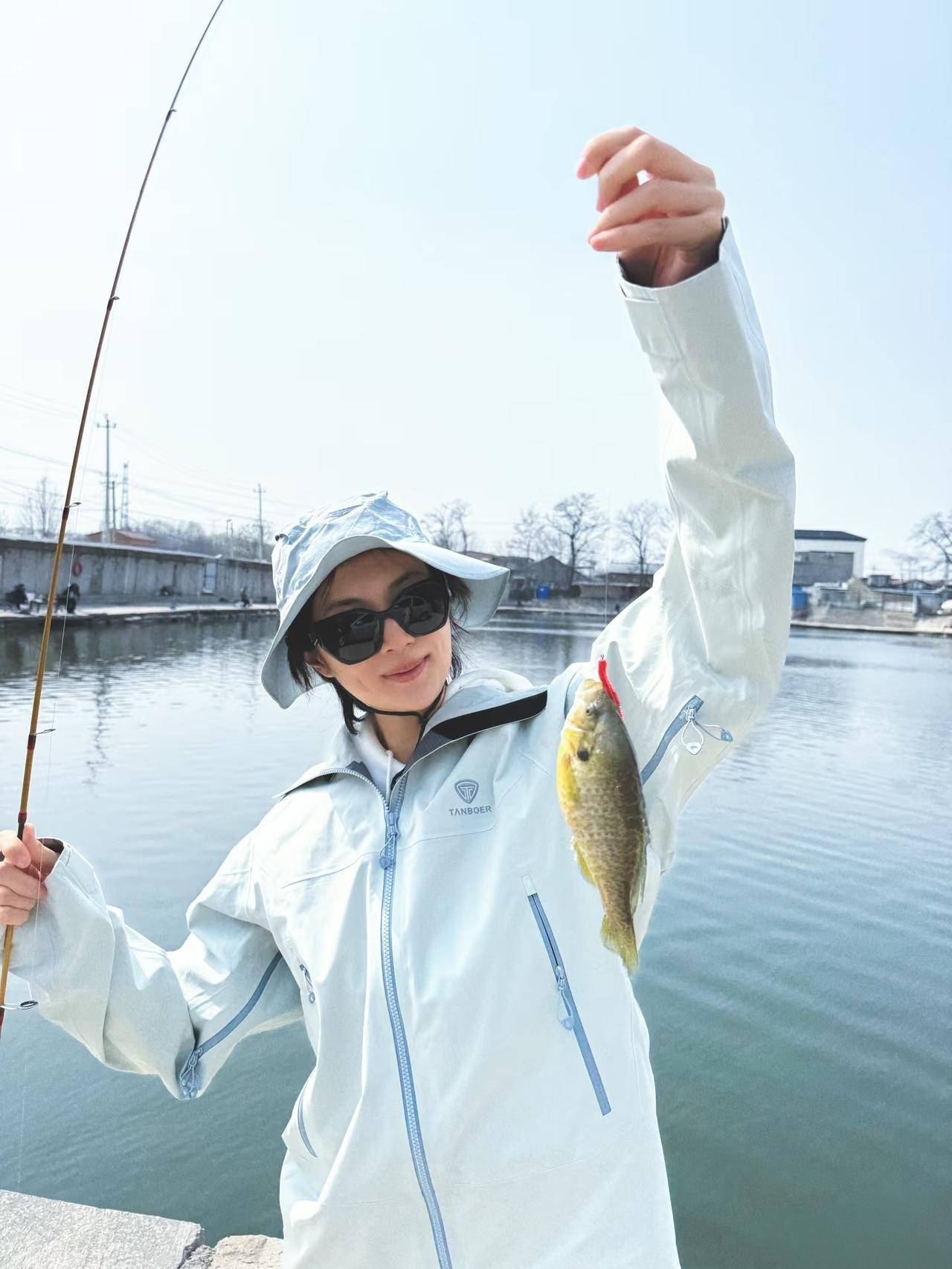 姚安娜穿着休闲, 在湖边钓鱼, 钓了一条小金鱼, 还钓了一条略大一些的小银鱼。 收获满满, 很开心! 公主的生活还是很悠闲幸福的!