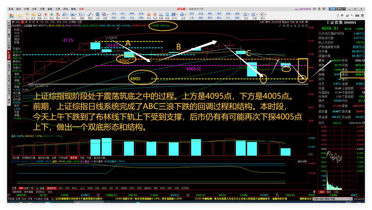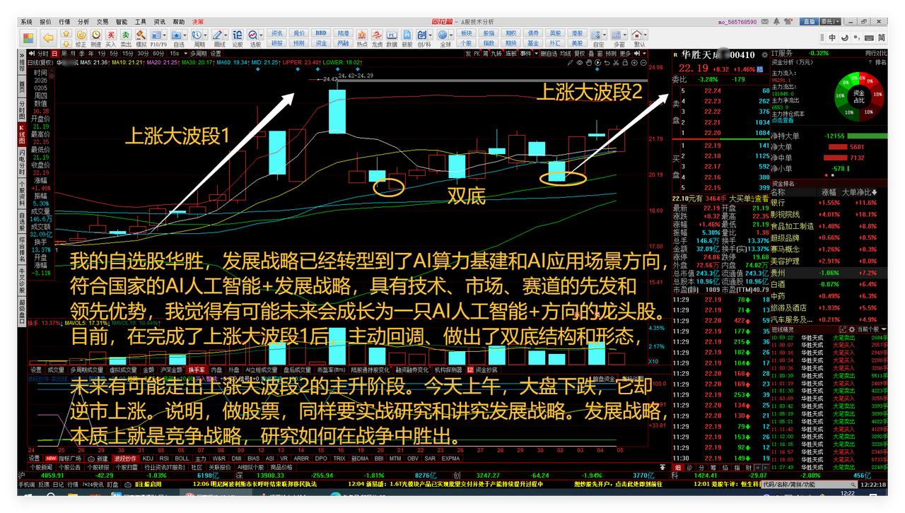 涨跌循环、只参与刚刚起涨趋势龙头股。大盘震荡筑底中。自选股华胜跟踪。 1、涨跌循环、只参与刚刚起涨趋势龙头股。 贵金属板块近期正在完成涨跌循环的时空转换。 之前的上涨大波段有多么强势,现在的下跌大波段就同样有多么强势。 今天上午,贵金属板块下跌6.84%,对A股大盘和人气有较大负面影响。 而它下面的三个获利筹码集中峰仍在,下跌结束后或许有超跌反弹。这说明上涨大波段启动初期的龙头股,选出、关注的价值更大。敬请参阅附图1。 2、大盘震荡筑底中。 上证综指现阶段处于震荡筑底之中的过程。上方是4095点,下方是4005点。 前期,上证综指日线系统完成了ABC三浪下跌的回调过程和结构。 本时段,今天上午下跌到了布林线下轨上下受到支撑,后市仍有有可能再次下探4005点上下,做出一个双底形态和结构。敬请参阅附图2。 3、自选股华胜跟踪。 我的自选股华胜,发展战略已经转型到了AI算力基建和AI应用场景方向,符合国家的AI人工智能+发展战略,具有技术、市场、赛道的先发和领先优势,我觉得有可能未来会成长为一只AI人工智能+方向的龙头股。 目前,在完成了上涨大波段1后,主动回调、做出了双底结构和形态,未来有可能走出上涨大波段2的主升阶段。今天上午,大盘下跌,它却逆市上涨。说明,做股票,同样要实战研究和讲究发展战略。 发展战略,本质上就是竞争战略,研究如何在战争中胜出。敬请参阅附图3。