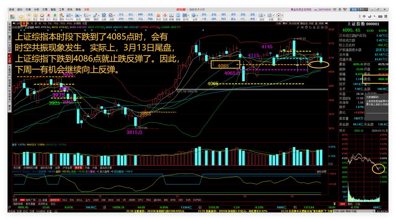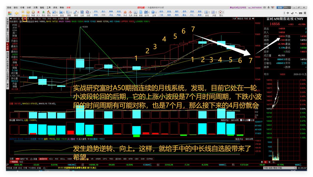 虽然26年3月13日一只自选股跌停板,心里不爽,但是A50、A股大盘下周或有转机,给个股一些 回血! 富时A50期指连续日线系统一是前期和最近,每次跌到14250点附近,都会止跌反弹,目前仍在反弹的趋势中;二是26年3月16日下周一的前半盘已经涨了0.76%,如果能够保持,那么将会影响和引导A股大盘下周一止跌反弹。敬请参阅附图1。 实战研究富时A50期指连续的月线系统,发现,目前它处在一轮小波段轮回的后期,它的上涨小波段是7个月时间周期,下跌小波段的时间周期有可能对称,也是7个月,那么接下来的4月份就会发生趋势逆转、向上。这样,就给手中的中长线自选股带来了希望。敬请参阅附图2。 上证综指本时段下跌到了4085点时,会有时空共振现象发生。实际上,3月13日尾盘,上证综指下跌到4086点就止跌反弹了。因此,下周一有机会继续向上反弹。敬请参阅附图3。 现在看多、看空的都有,让我们等到下周一见分晓吧。