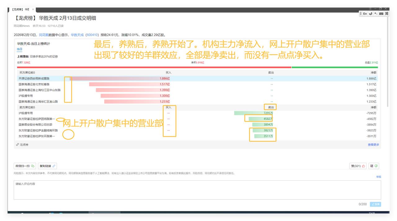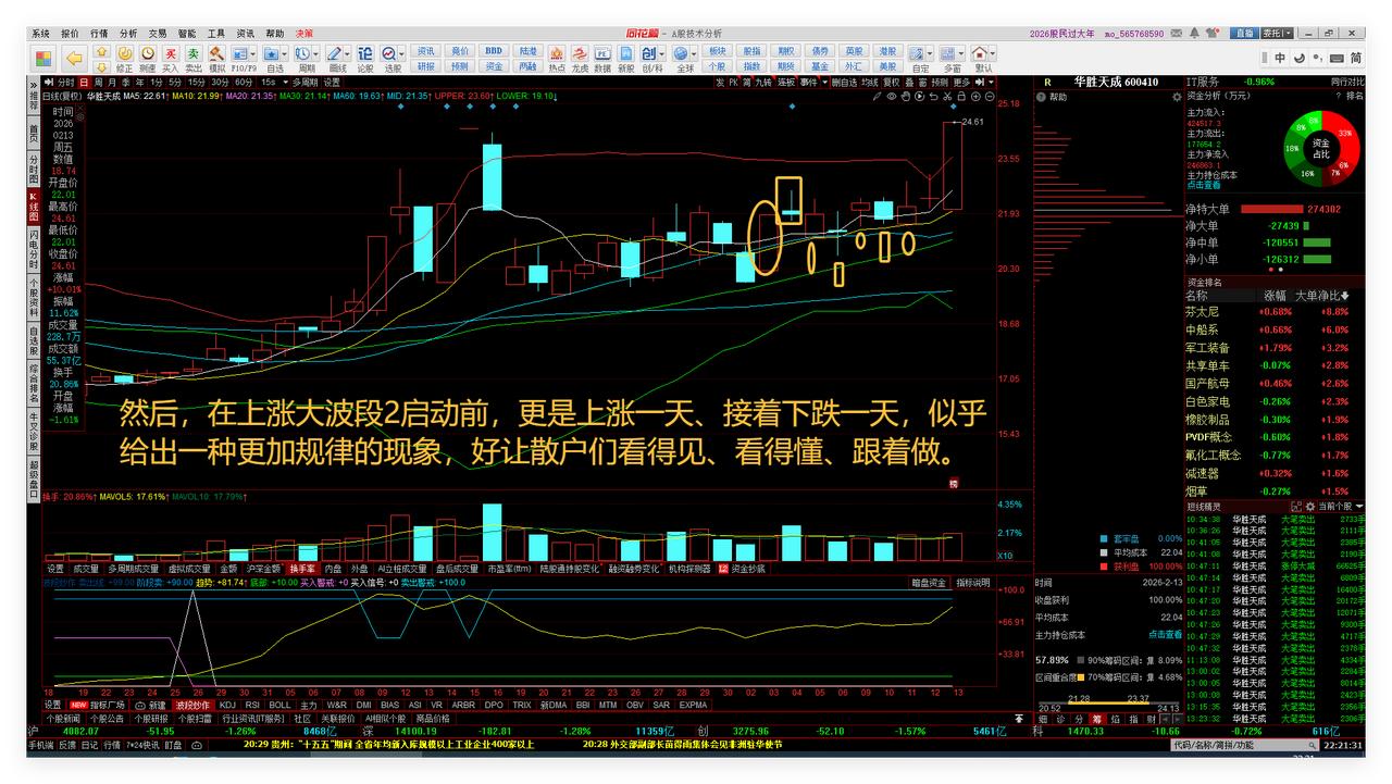 散户惯性思维、惯性行为的养熟、杀熟与羊群效应扩散。 我的中长线自选股和超短线自选股华胜天成,日线系统中存在着非常明显、比较规律的上涨小波段、下跌小波段之间的小波段轮回现象。敬请参阅附图1。 然后,在上涨大波段2启动前,更是上涨一天、接着下跌一天,似乎给出一种更加规律的现象,好让散户们看得见、看得懂、跟着做。敬请参阅附图2。 最后,养熟后,养熟开始了。机构主力净流入,网上开户散户集中的营业部出现了较好的羊群效应,全部是净卖出,而没有一点点净买入。敬请参阅附图3。 由此可见: 散户云集的地方,并不一定容易赚到钱。 而现在和未来大资金集中净流入的方向和地方,也许很容易赚到钱。