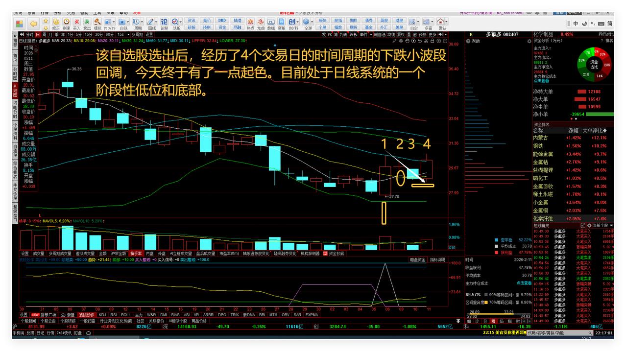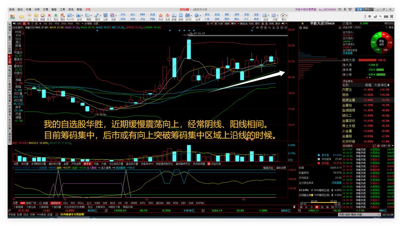 新增超短线自选股振石GF。自选股华胜TC、多伦D跟踪。 1、新增超短线自选股振石GF。 该自选股是全球领先的风电叶片材料制造商,风电玻纤织物市占率全球第一。成长性较好。 该自选股日线系统相对低位,第一次出现筹码集中的趋势。我觉得后市有关注价值。敬请参阅附图1。 2、自选股华胜TC、多伦D跟踪。 我的自选股华胜,近期缓慢震荡向上,经常阴线、阳线相间。目前筹码集中,后市或有向上突破筹码集中区域上沿线的时候。敬请参阅附图2。 该自选股选出后,经历了4个交易日的时间周期的下跌小波段回调,今天终于有了一点起色。目前处于日线系统的一个阶段性低位和底部。敬请参阅附图3。