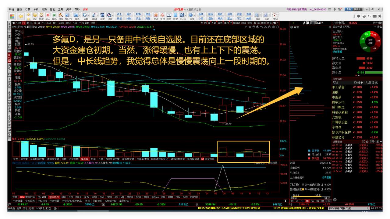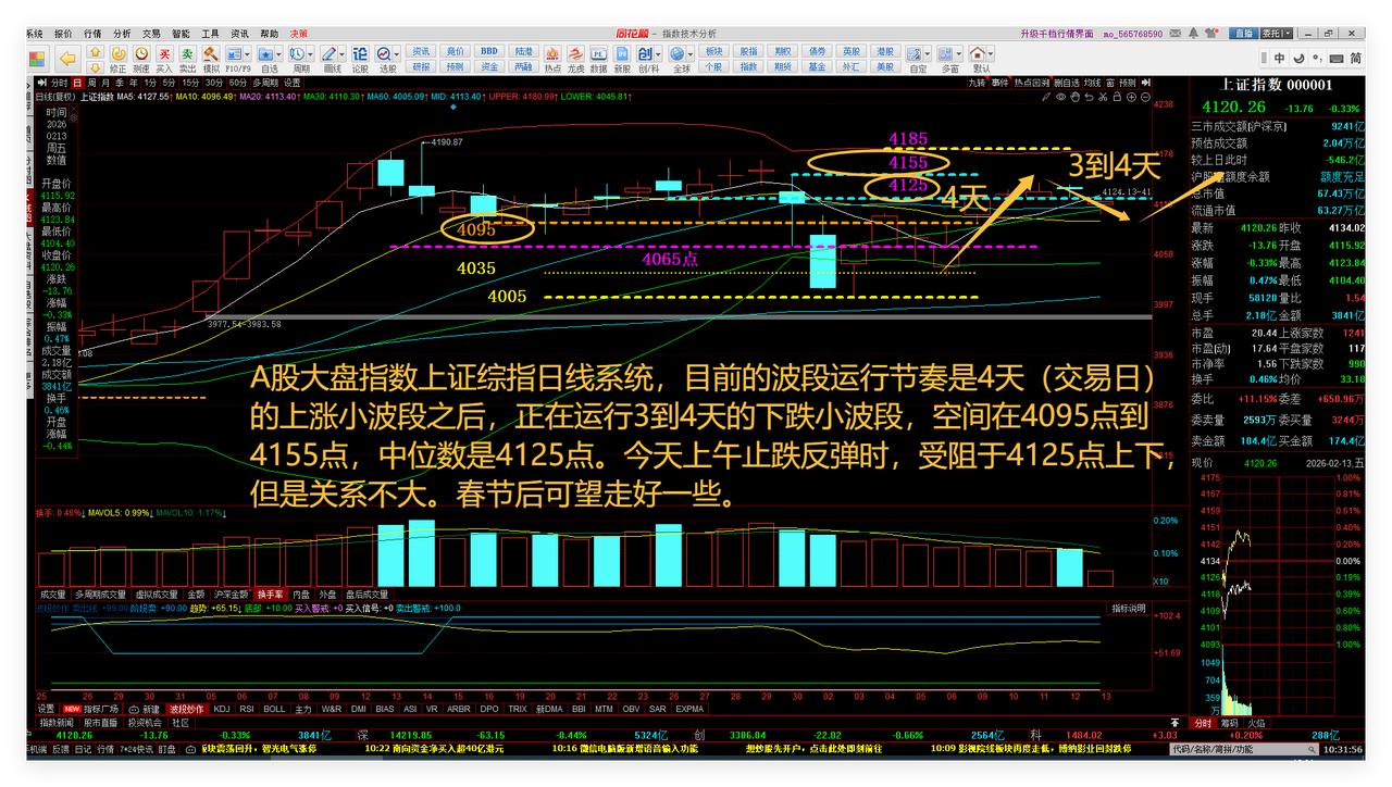 A股股市26年春节前红包预判兑现了!我持仓过年。 1、华胜TC: 我的中长线自选股华胜天成今天终于涨停板了,算是26年春节红包10%。敬请参阅附图1。 在此,全心全意,提前祝福股友们:春节快乐、每月赚钱! 2、多氟D: 多氟D,是另一只备用中长线自选股。目前还在底部区域的大资金建仓初期。当然,涨得缓慢,也有上上下下的震荡。但是,中长线趋势,我觉得总体是慢慢震荡向上一段时期的。敬请参阅附图2。 3、大盘: A股大盘指数上证综指日线系统,目前的波段运行节奏是4天(交易日)的上涨小波段之后,正在运行3到4天的下跌小波段,空间在4095点到4155点,中位数是4125点。今天上午止跌反弹时,受阻于4125点上下,但是关系不大。春节后可望走好一些。敬请参阅附图3。