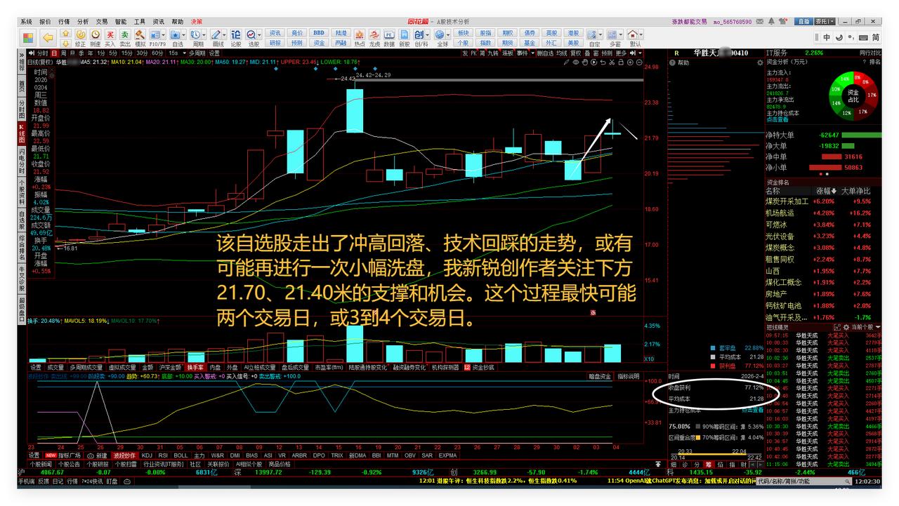 A股大盘进入新时段,或震荡蓄力。中长线自选股华胜跟踪或最后震荡洗盘。立春,开启26年赚钱新周期了。 1、A股大盘进入新时段,或震荡蓄力。 A股大盘进入新时段15个自然日,即从今日的26年2月4日到2月18日。春节前虽然还有两个交易周,但是只余下7个交易日了,或许有部分资金需要提前兑现离场,准备春节前结算了。因此冲高时,可能有减仓、回落情形。 今天上午,上证综指走势非常适合客观规律,冲高到4085点上下的4087点回落,下跌到4065点上下的4062点止跌反弹。总体上呈现冲高回落走势,过年休息的味道越来越近了。敬请参阅附图1。 2、中长线自选股华胜跟踪或最后震荡洗盘。 该自选股走出了冲高回落、技术回踩的走势,或有可能再进行一次小幅洗盘,我将会关注下方21.70、21.40米的支撑和机会。这个过程最快可能两个交易日,或3到4个交易日。敬请参阅附图2。 3、立春,开启26年赚钱新周期了。 敬请参阅附图3。