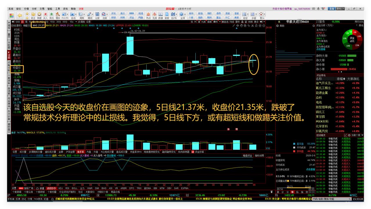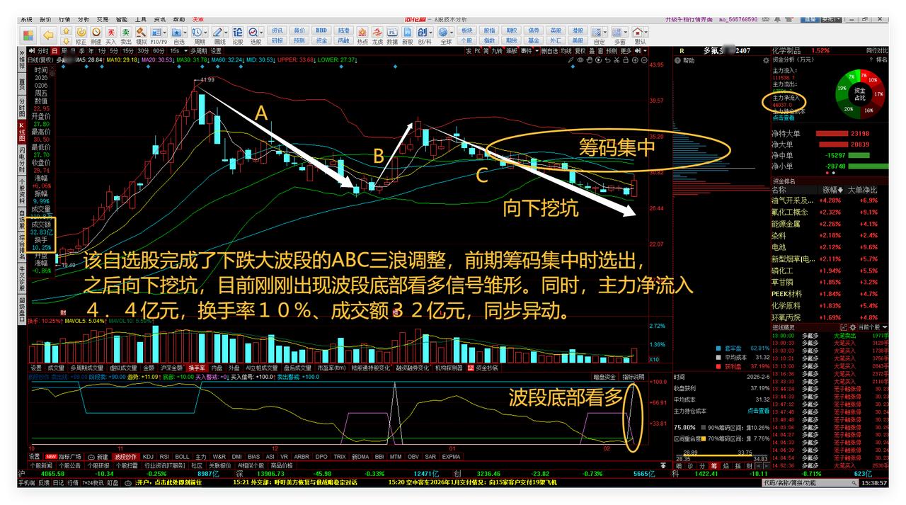 备战26年春节前红包行情!第4次论4065点重要性、大盘小波段二次探底或将结束! 自选股跟踪! 1、备战26年春节前红包行情! 我觉得,有可能发生26年春节前红包行情!所以,现在需要备战,春节前还有5个交易日。 2、第4次论4065点重要性! 实战研究江恩理论的时空关系理论可以推演出:4065点是A股大盘指数上证综指26年往后的未来5年的多空标杆之一。今天,上证综指收盘正好就在4065.58点,表示将要“我发”了吗? 3、大盘小波段二次探底或将结束! 上证综指日线系统第一次下跌小波段探底时的最低点4005点上下,在第一次谈论大盘不可能跌破4000点的文章中进行过分享,实际低点到达了4002点。 第二次下跌小波段探底的最低点,在今天中午的微头条中有分享,到达了4035点+/-5点和4005点+/-5点都可以发生止跌反弹。 无论下周一是否向下继续探底,按照这次下跌小波段的时间周期计算,已经到了结束的时点。敬请参阅附图1。 4、自选股跟踪! 该自选股今天的收盘价在画图的迹象,5日线21.37米,收盘价21.35米,跌破了常规技术分析理论中的止损线。我觉得,5日线下方,或有超短线和做踢关注价值。敬请参阅附图2。 该自选股完成了下跌大波段的ABC三浪调整,前期筹码集中时选出,之后向下挖坑,目前刚刚出现波段底部看多信号雏形。同时,主力净流入4.4亿元,换手率10%、成交额32亿元,同步异动。敬请参阅附图3。 预祝老铁们,周末快乐!我周末有空、有好心情就写文章,具体看情况。